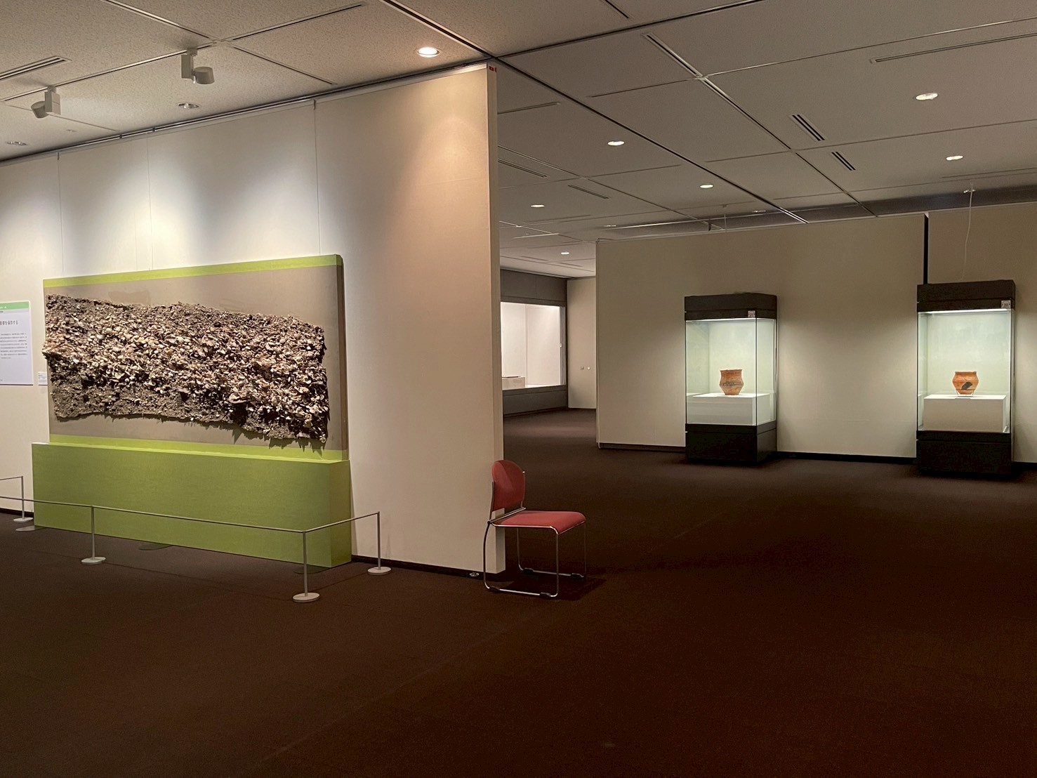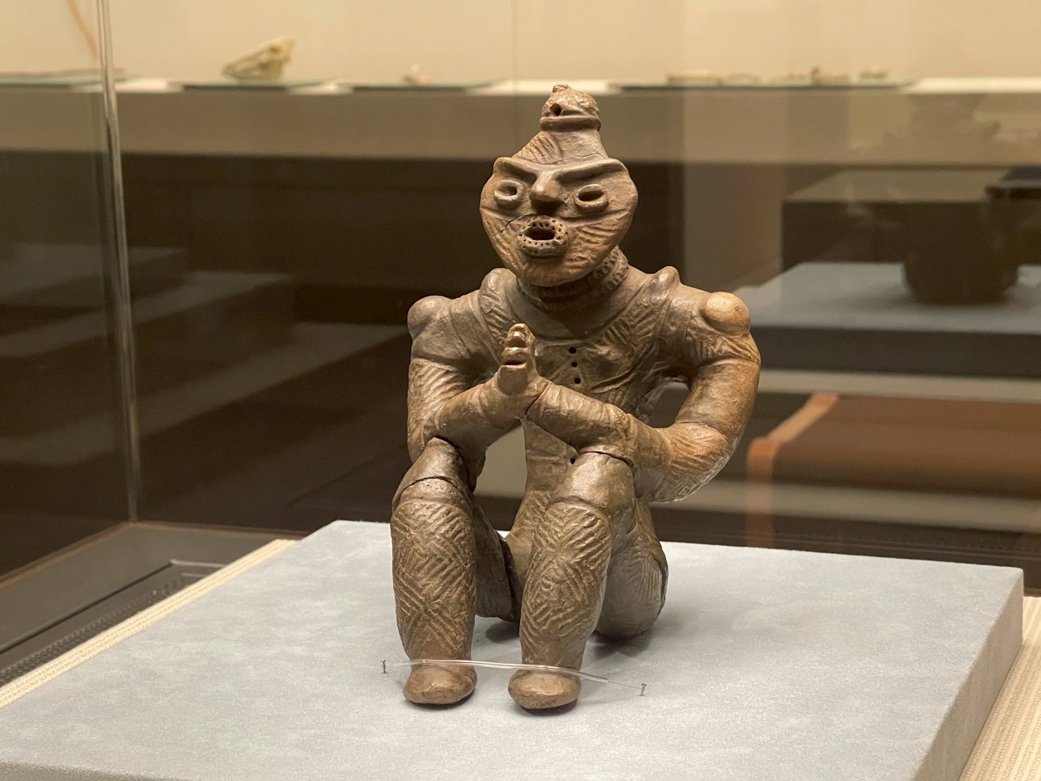 そして後半に展示される北海道著保内野遺跡出土の「中空土偶」。その名の通り、内部が空洞になっており、非常に軽量かつ精巧な作りであることに驚かされる。写実的で洗練されたフォルムは、どこか現代彫刻にも通じる普遍的な美を宿している。この土偶は墓から発見されたとも言われており、その用途については死者の魂の再生を願う器であったなど諸説あるが、その謎多き姿は私たちの想像力を無限に掻き立てる。