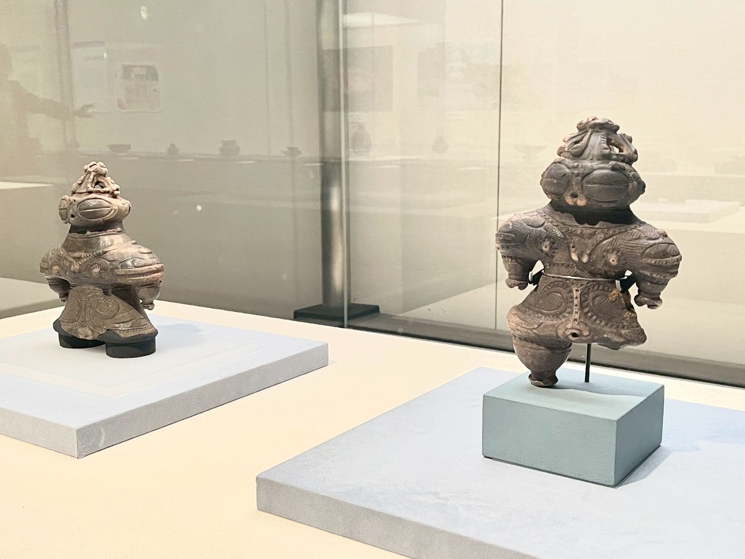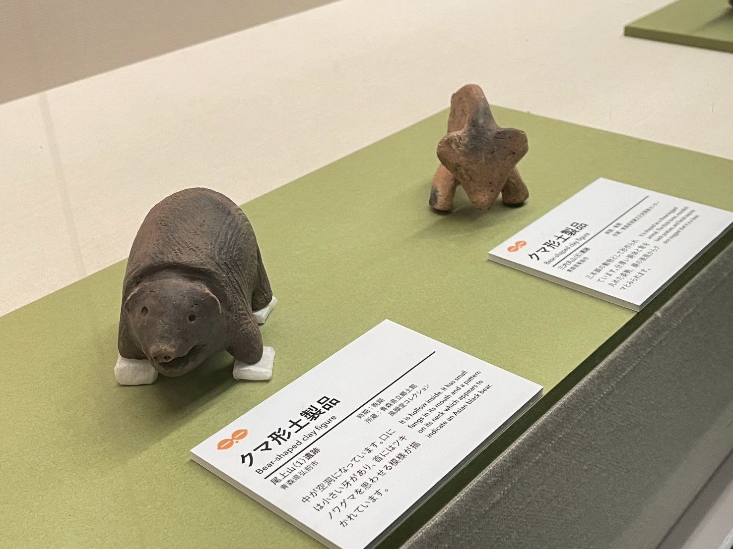 手前:クマ形土製品 青森県立郷土館 風韻堂コレクション 奥:クマ形土製品 青森県埋蔵調査センター