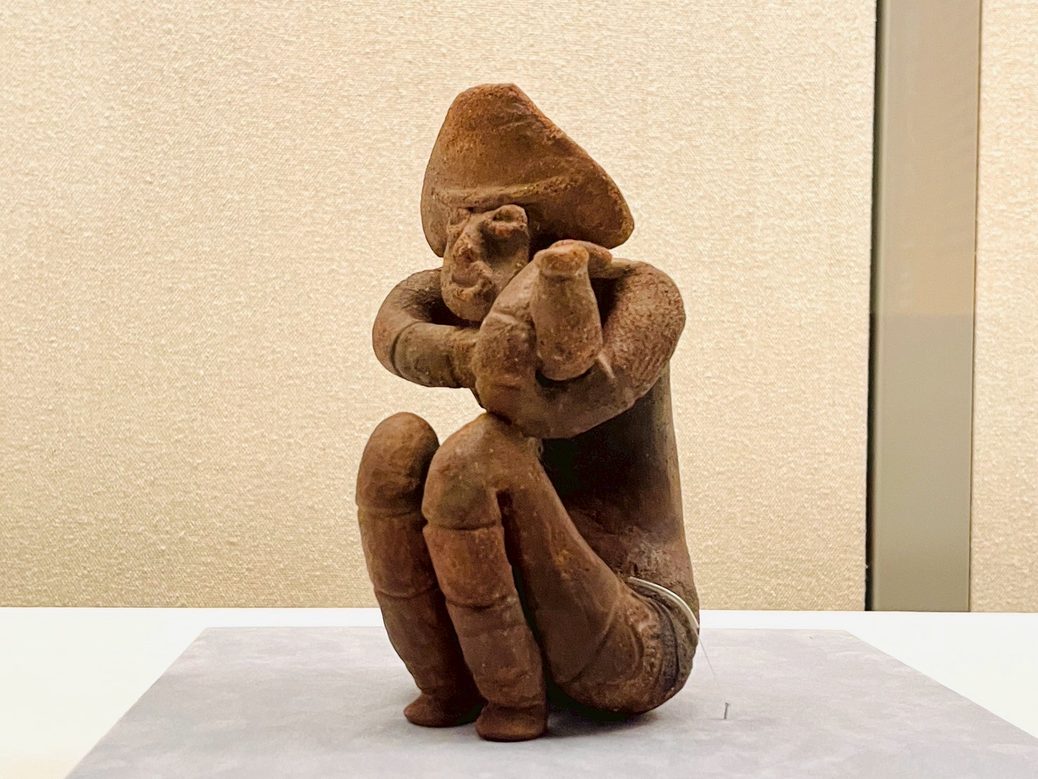重要文化財 しゃがむ土偶 福島市蔵 膝を深く折り曲げて腰を下ろし、膝の上で腕を組んでいる。出産の様子を表現したものと考えられている