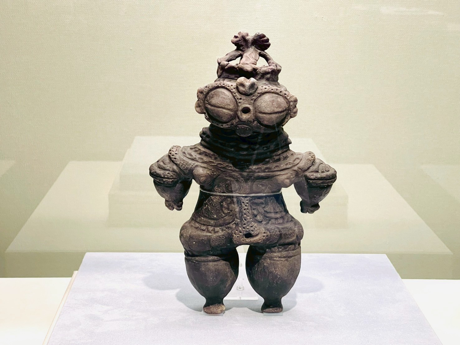 本展のハイライトが、圧倒的な存在感を放つ土偶の数々であることは言うまでもない。特に、会期を分けて展示される二つの国宝、「縄文の女神」と「中空土偶」は必見である。前半に登場する山形県西ノ前遺跡出土の「縄文の女神」は、高さ45cmという国内最大級の大きさを誇る。豊満で安定した体躯は、生命を生み出す母なる大地そのものを想起させる。その均整の取れたプロポーションと滑らかな仕上げは、縄文人の美意識の高さと卓越した造形技術の証しだ。静謐な表情でたたずむその姿を前にすると、私たちは豊穣や安産への切実な祈りの声が聞こえてくるような感覚に包まれる。