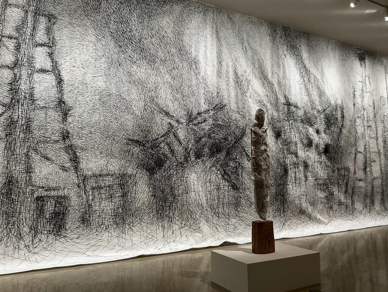 そして、この展示室で圧倒的な存在感を放つのが、巨大な《福島原発爆発ドローイング》である。黒いアクリル絵の具を叩きつけるようにして描かれた無数の線は、制御不能なエネルギーの爆発と、それによって引き裂かれた世界の姿を克明に描き出す。歪んだ鉄塔、混沌の中に飲み込まれていく光景は、まさに地獄絵図だ。しかし、そのすさまじい破壊のエネルギーと対峙するように、一体の《Being》が静かに立っている。