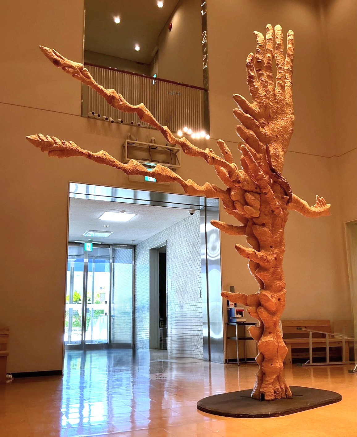 古代より多くの祈りを受け止めてきた奈良という土地が、安藤の制作に深い精神性を与えていることは想像に難くない。歴史と自然が息づくこの地で、作家は自身の内面と対峙し、魂の再生の物語を紡ぎ始めたのである。彼の制作は単なる自己表現ではない。「今の日本の気を守るために列島と天を光の柱で繋ぐための道具、ライトワークという意識でいる」と作家が語るように、その彫刻は大地と天を繋ぎ、傷ついた魂に光を届けるための祈りの媒体そのものなのだ。
