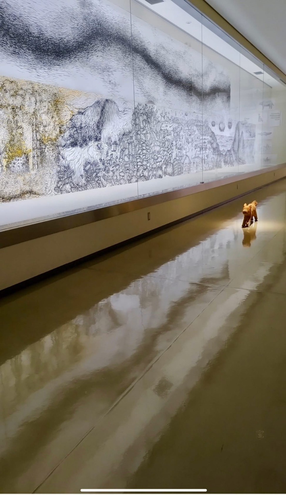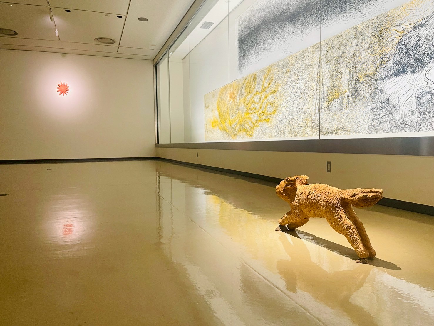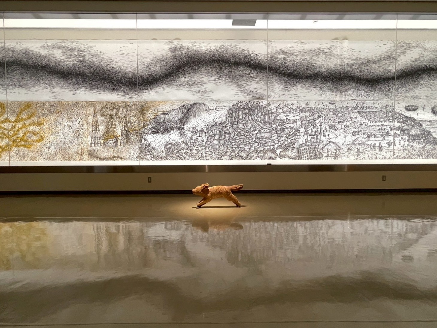 展示室の中央で、私たちの視線を釘付けにするのは、一体の犬の彫刻《ユイ》である。これは、津波で行方不明になった安藤の愛犬だ。今にも駆け出しそうな躍動的な姿で彫り出されたユイは、鑑賞者の前を横切り、壁面の巨大なドローイング《Life》と《光の川》の方へと向かっていく。その背景には、破壊された町の風景や、黒くうねる津波を思わせる抽象的な線描が広がる。