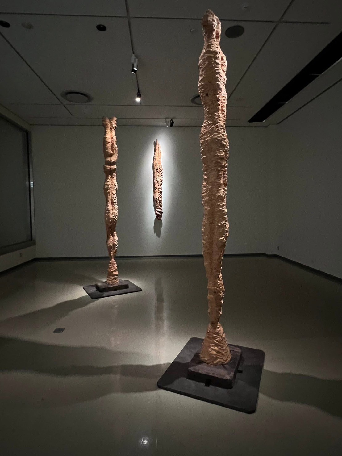 続く第2展示室のテーマは「3.11 光のさなぎたち」。ここでは、震災というカタストロフを経て、魂が変容していく様が表現される。まず目に飛び込んでくるのは、天に向かって伸びる数本の木彫、《つばさ・福島》と《ひかりのさなぎ》だ。手斧による荒々しい削り跡が生々しく残るそのフォルムは、蛹のようでもあり、立ち尽くす人のようでもある。それは、死と破壊の中から新たな生が生まれ出ようとする力強い生命のメタファーだ。絶望の中で見出した希望の光、その萌芽がここにある。