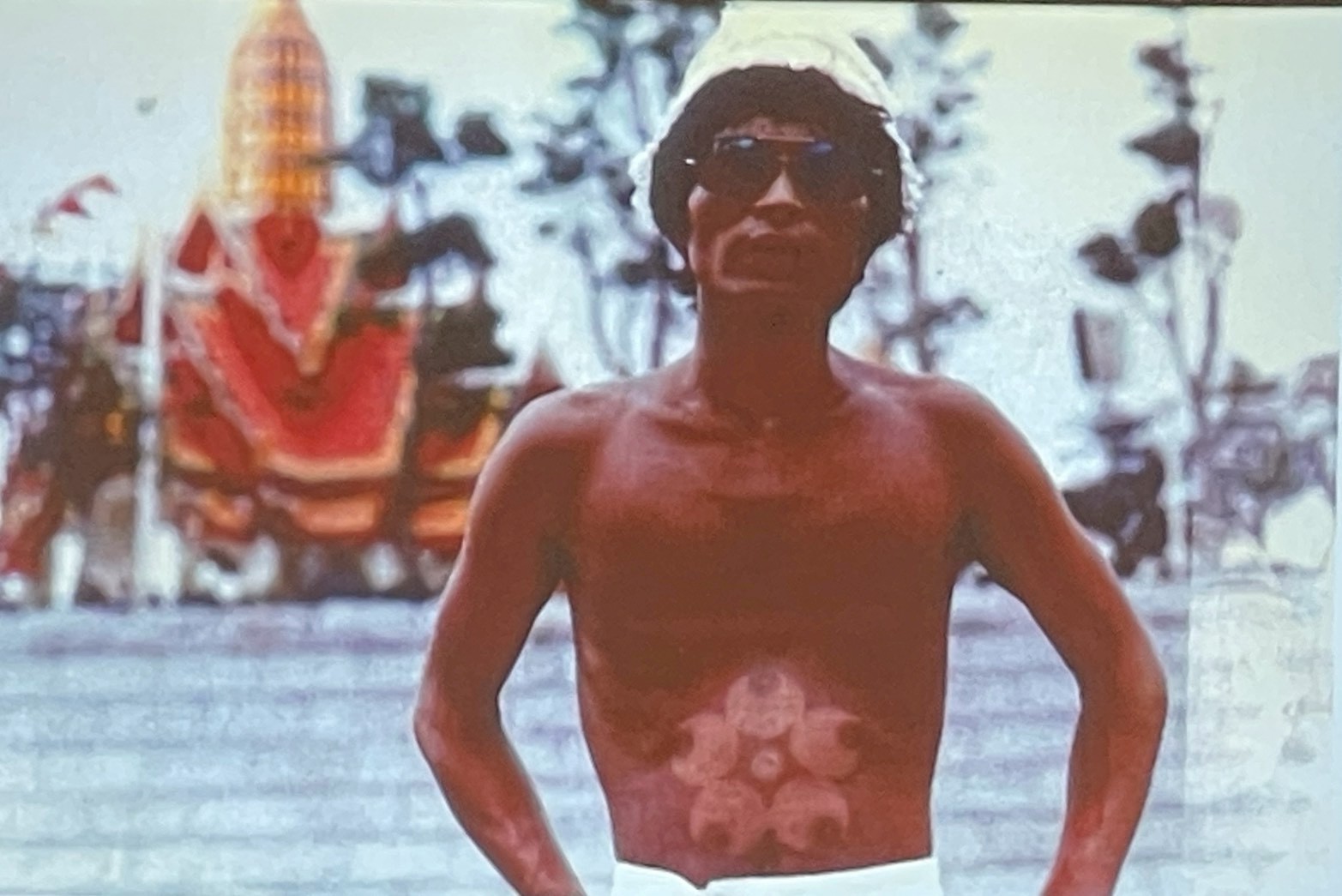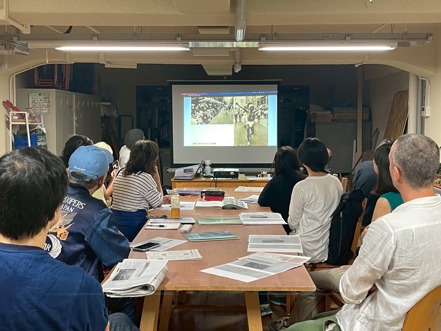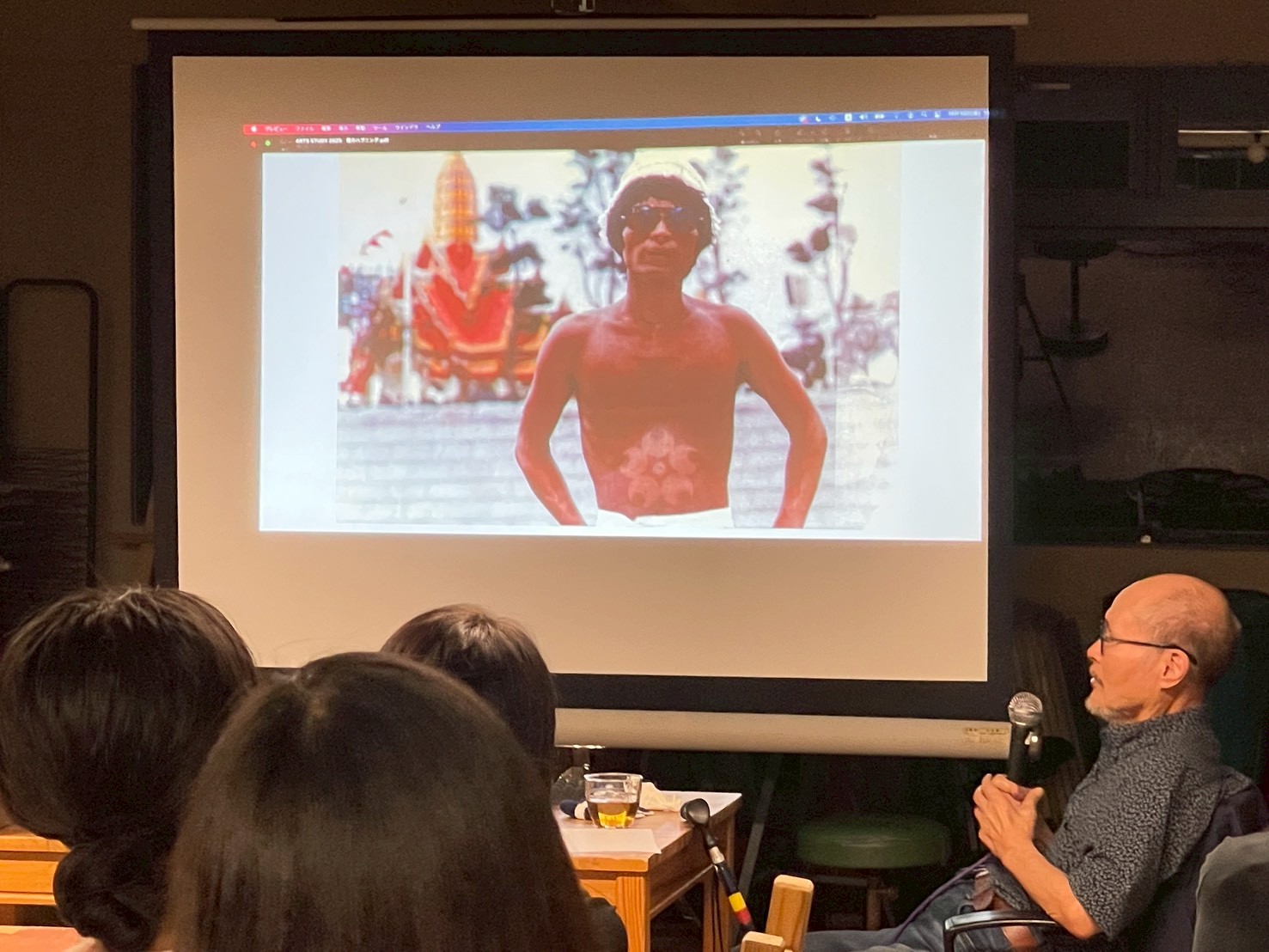 ゼミの冒頭、スクリーンに映し出されたのは、サングラスをかけ、口ひげを描き、腹部に日焼けで描かれた万博マークを晒す若き日の榎忠の写真だ。当時26歳。あまりにも有名なこのイメージは、しかし、1970年8月2日に銀座の歩行者天国で実行された最初の《裸のハプニング》そのものではく、後にUCC缶コーヒーの広告モデルとして万博会場で撮影されたものだ。実は、銀座での行為を記録した写真はほとんど残っていない。この事実が、まず私たちに重要な問いを投げかける。私たちは《裸のハプニング》という「作品」を鑑賞しているのか、それとも語り継がれてきた「伝説」に触れているのか。このゼミは、その伝説の核心に作家自身の言葉で迫る、貴重な機会となった。
