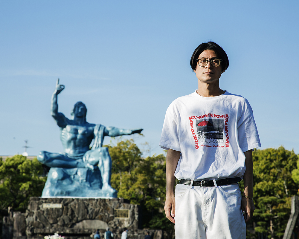 《祈り/長崎》(2015-2024)は、カトリック信仰が色濃く残る長崎を舞台に、信仰者たちや聖像、そして平和祈念像といったモチーフと、作家自身のセルフポートレートを並置する。会場の配布資料『祈り/長崎』で、金川は自身の受洗体験や、プロテスタントの立場から見たカトリックの聖像、そして平和祈念像への複雑な思いを率直に綴っている。「信仰」という、近代以降の公的領域が手放してきたものを、彼は自身の身体とカメラを通して、現代社会のコンテクスト(長崎という被爆地、公共空間のモニュメント)の中で捉え直そうと試みる。