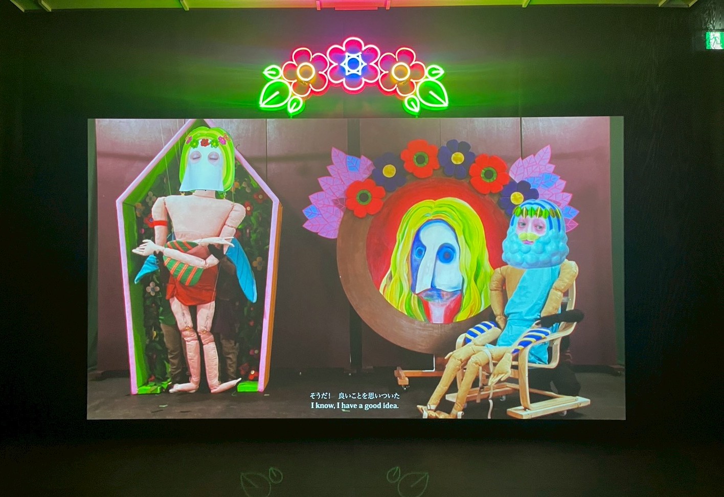 笹岡由梨子(1988年 大阪府生まれ)の実践は、一見するとポップでユーモラスな装いを纏う。彼女は、絵画と映像、現実と虚構、生と死の間を探るべく、人形劇やローテクなCG合成、自作の歌、手作業による装飾を駆使した映像インスタレーションを制作。作品内において、さまざまなキャラクターを演じ、身体パーツを複数化し、固定化された枠組や見方に揺さぶりをかける。