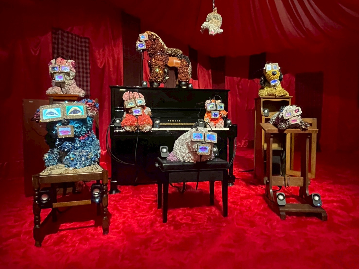 本展では初期の映像作品と、国内初公開となる《Working Animals》(2025)が展示され、その批評性を端的に示す。古いぬいぐるみから再生された動物たちが合唱しながら、観客である「人間」に対し、労働の意味や搾取の構造について問いかけるこのインスタレーション。愛らしいキャラクターたちが突きつける根源的な問いは、私たち人間中心の社会システムや資本主義のあり方そのものへの痛烈な皮肉だ。これは、田部が「一流労組のカンパニヤ」のプラカードに感じた欺瞞を、現代的な寓話として暴き出す試みと言えるだろう。