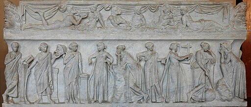 ローマ時代2世紀前半の大理石製《ミューズの石棺》 下段、右から3番目がムーサ(Musa) Photo by Jastrow, Muses Sarcophagus, marble, first half of the 2nd century AD, found by the Via Ostiense. Louvre Museum, Department of Greek, Etruscan and Roman Antiquities (inventory MR 880 [Ma 475]). Source: Wikimedia Commons – File:Muses sarcophagus Louvre MR880.jpg
