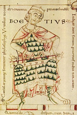 ボエティウス(西暦480年頃-524年) Anicius Manlius Torquatus Severinus Boethius 古代ローマ末期の哲学者、政治家、修辞学者 Anicius Manlius Severinus Boëthiusの中世の挿絵、出典:De institutione musica by Boethius, 12th century, Cambridge University Library(Wikimedia Commons) URL:https://commons.wikimedia.org/wiki/File:Boethius.jpeg