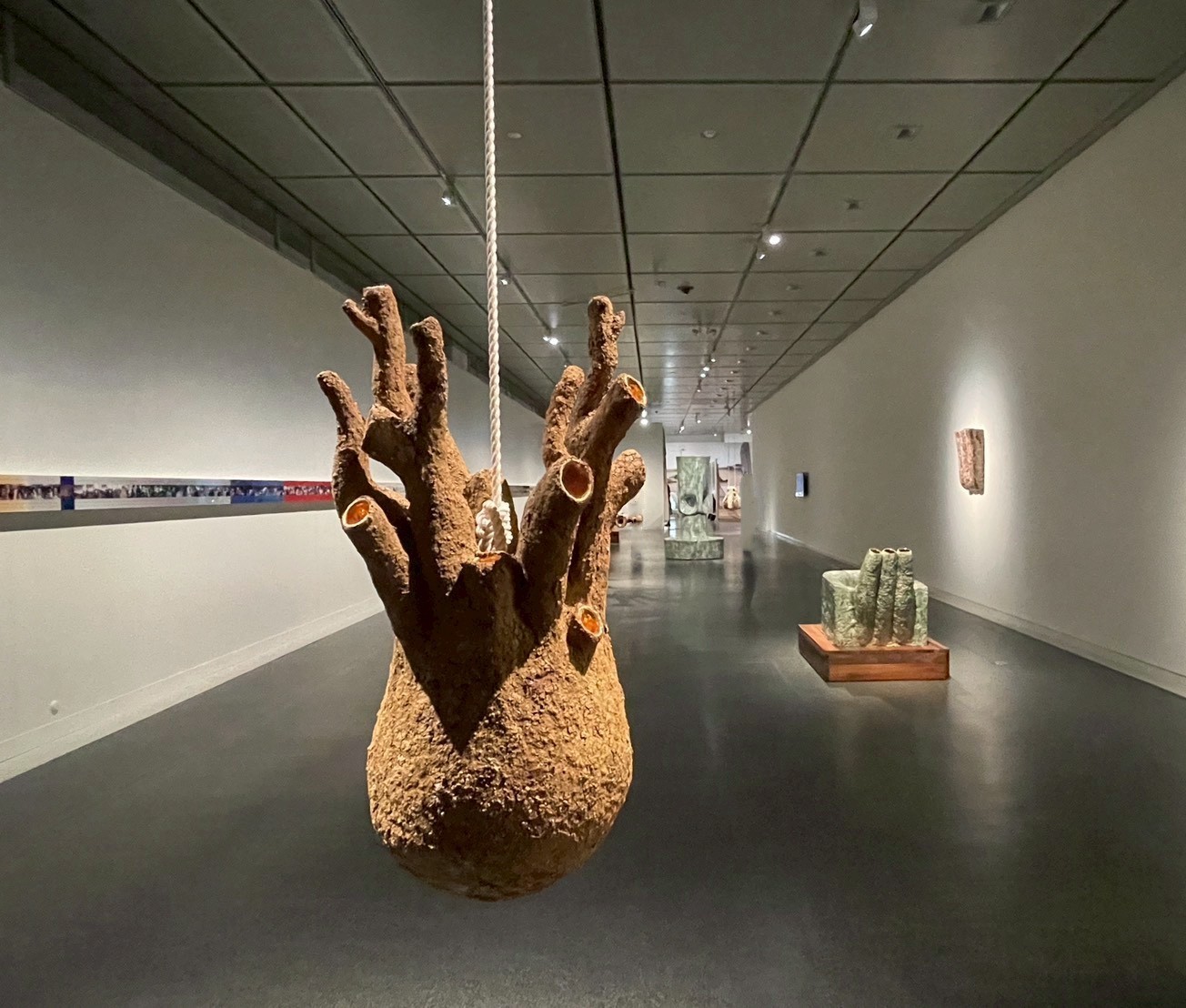 展示風景 手前:西條茜 《シーシュポスの柘榴》2025 陶 107.0×60.0×54.0 作家蔵