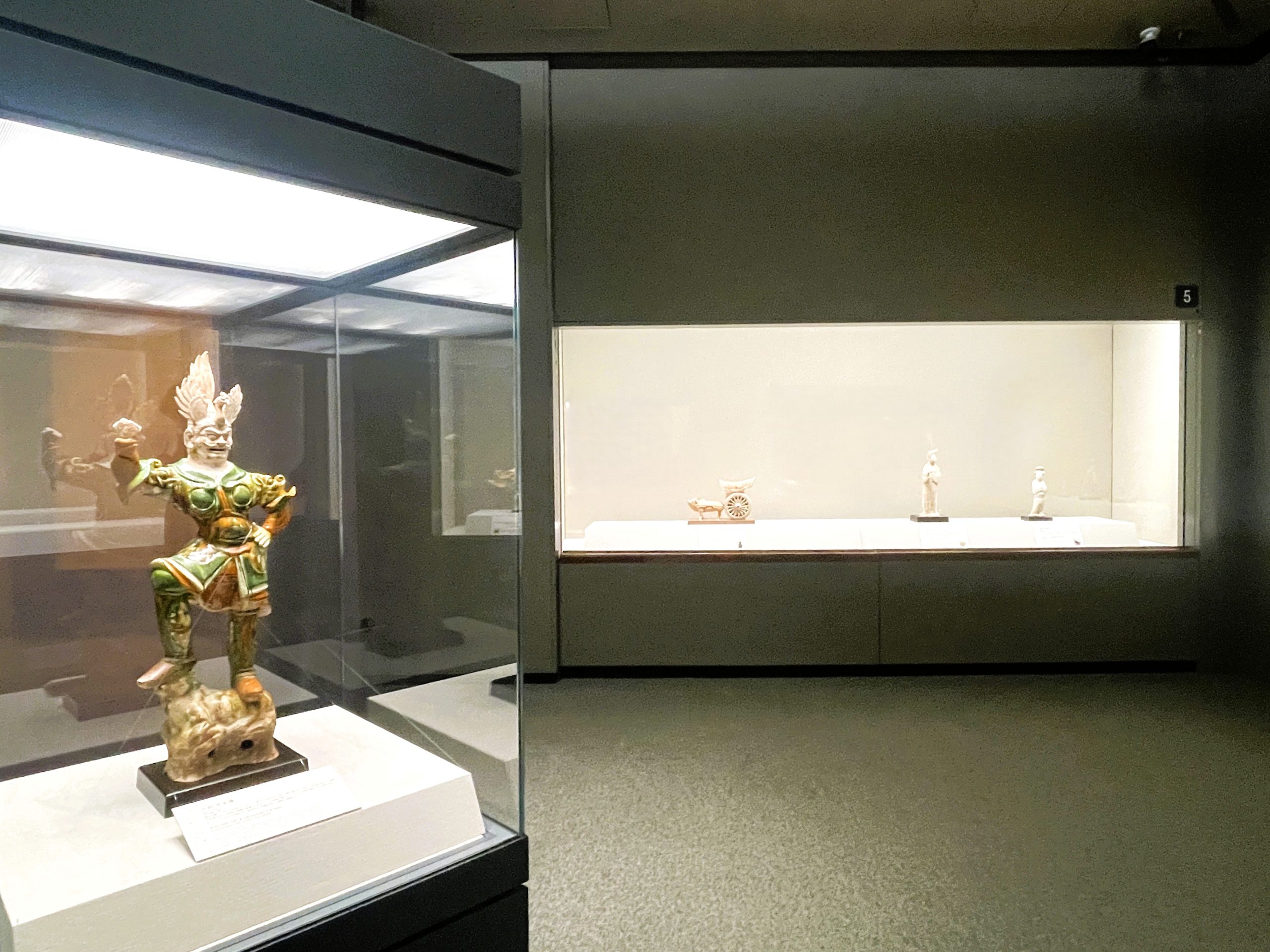 展示風景 手前:三彩天王俑 唐時代(8世紀)大阪市立東洋陶磁美術館(海野信義氏寄贈) 墓を外敵から守る天王だが、No.11に展示する加彩天王とは趣が異なる。伝説上の鳥を象った「鶡冠」や甲冑を彩る三彩釉の華麗な装飾が、天王としての威厳を際立たせている。四肢の動きにやや硬さが見られることから700年代初頭の作と推測され、洛陽近郊では類例も確認されている。