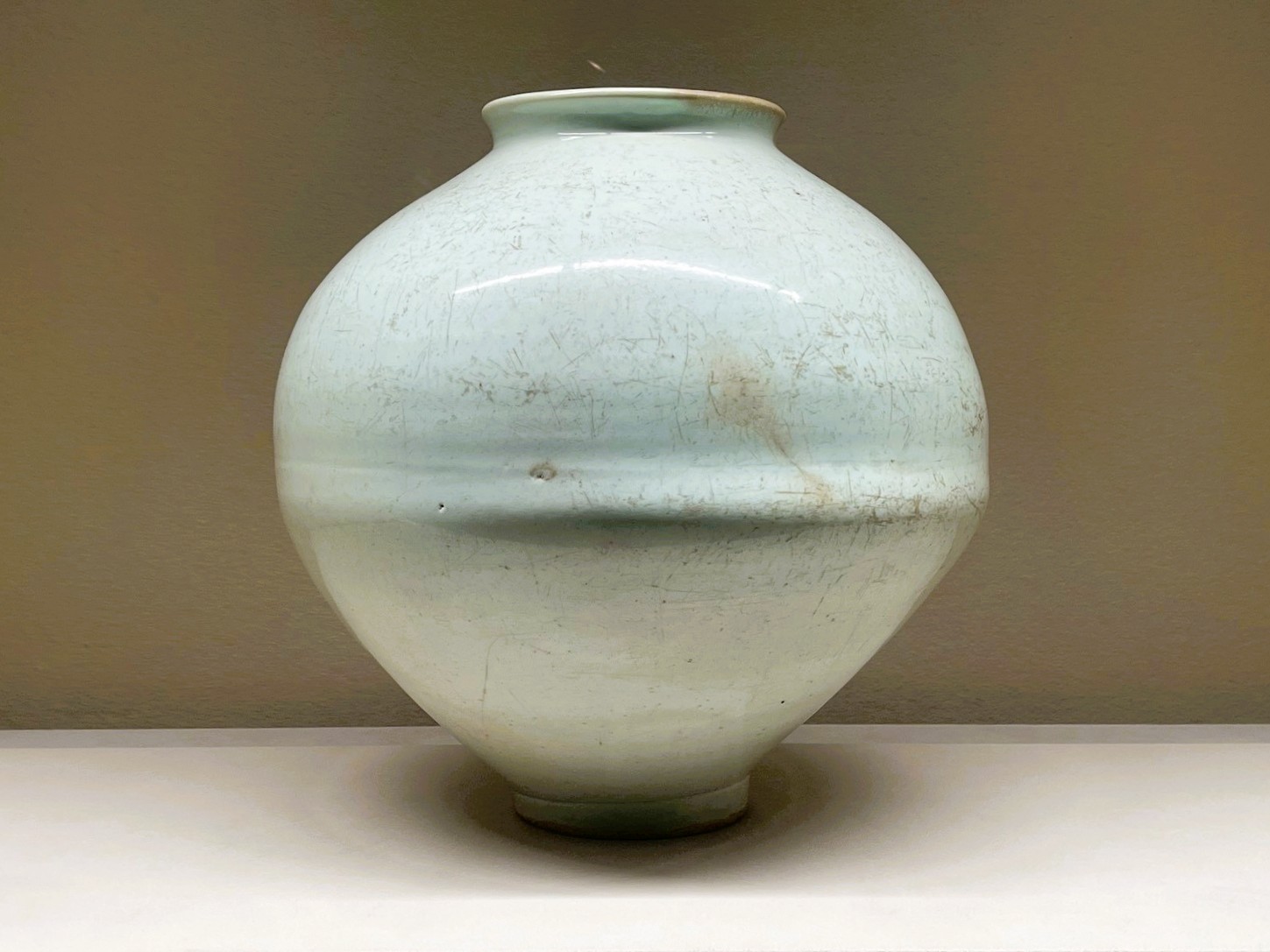 白磁壺 朝鮮時代(18世紀前半) 高47.6cm、径47.0cm 大阪市立東洋陶磁美術館(鈴木正男氏寄贈) 韓国では「満月壺(タルハンアリ)」とも呼ばれる白磁の大壺。ゆがみを伴い ながらも、高さと幅の比率はほぼ一対一で、均整が取れている。彫刻家を目 指していた浅川伯教は、白磁壺を古代ギリシアの大理石彫刻と重ね、造形美を感じ取っていた。