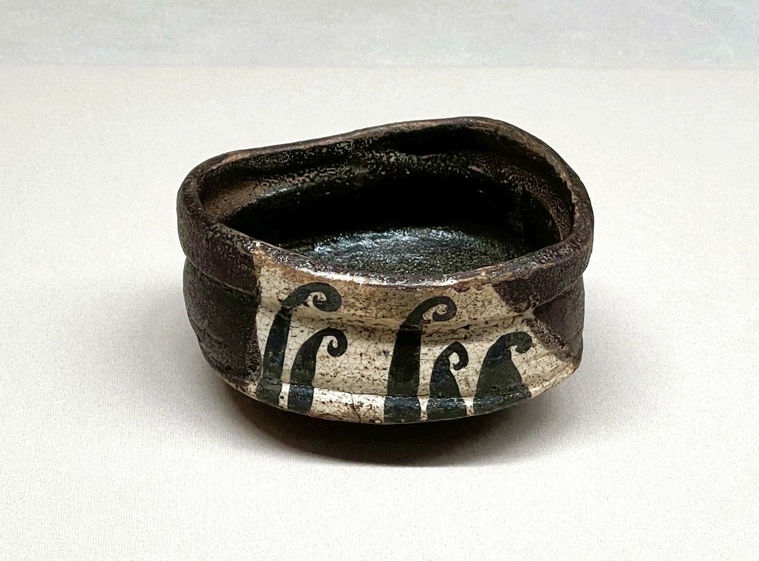 黒織部波文茶碗 桃山時代(17世紀)/美濃窯 高7.4cm、幅13.7cm 大阪市立東洋陶磁美術館(松惠コレクション) 歪みを伴う力強い茶道具は、桃山時代の茶の湯をリードした茶人である、武将 の古田織部(ふるたおりべ)の美意識を反映している。躍動感のあるデフォル メされた波の文様が印象的。