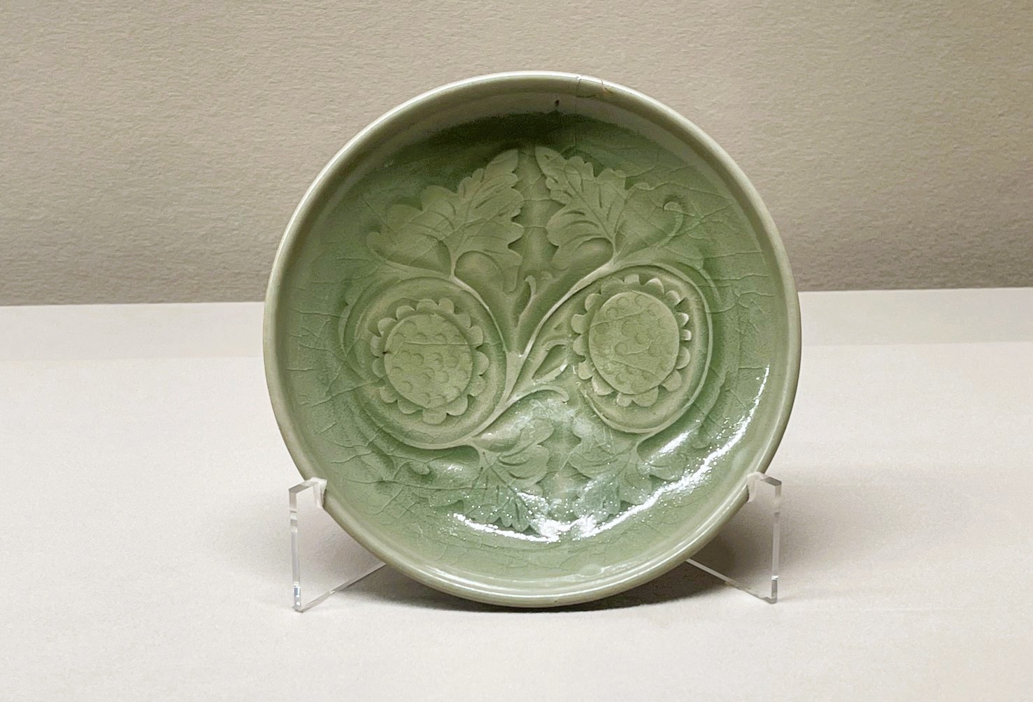 青磁刻花花文盤 金時代(12世紀)/耀州窯 高4.5cm、径18.3cm 大阪市立東洋陶磁美術館(入江正信氏寄贈) 耀州窯(ようしゅうよう/陝西省)で生産された青磁は、オリーブグリーンの釉 色を特徴とする。工具の刃を斜めにねかせて彫る「片切彫(かたきりぼり)」 という技法により、盤の内側に二輪の花と枝葉が力強く刻まれる。釉薬が彫っ たくぼみに厚くたまることで、文様に豊かな陰影が生まれる。