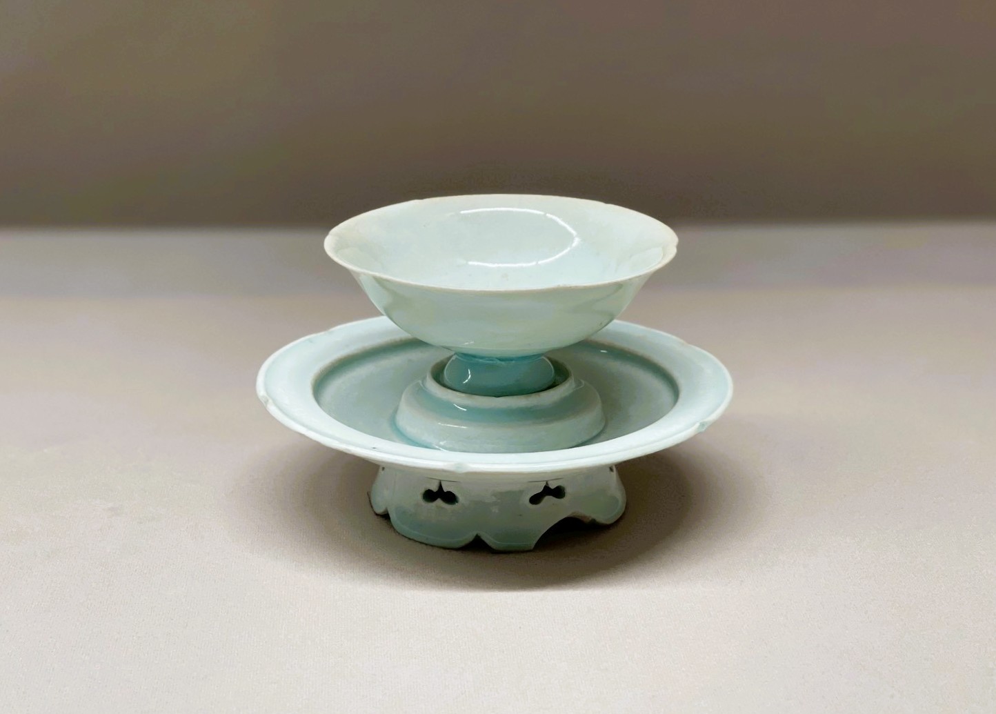 青白磁輪花杯・托 北宋時代(11-12世紀)/景徳鎮窯 杯:高4.8cm、径10.5cm、托:高4.5cm、径14.5cm 大阪市立東洋陶磁美術館(入江正信氏寄贈) 青白磁は、青みを帯びた白磁のことで、北宋時代に景徳鎮窯(けいとくちんよう) などで生産された。薄づくりで端正な形をした杯と托のセットである。酒器や 茶器として用いられたもので、托のつばには杯を伏せて置くための浅い溝がめぐる。
