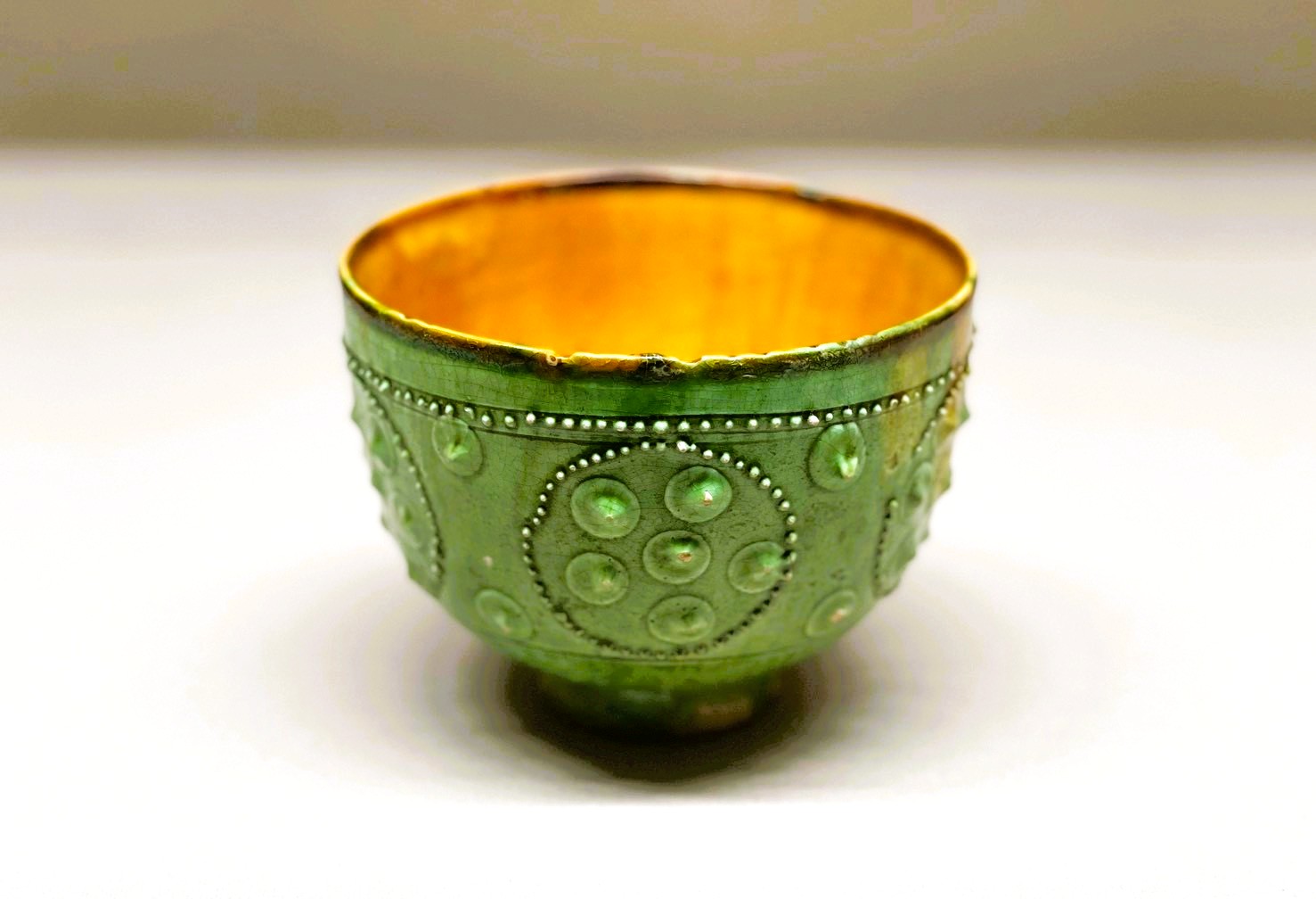 緑褐釉貼花連珠文碗 北斉~隋時代(6世紀後半) 高9.0cm、径11.8cm 大阪市立東洋陶磁美術館(卯里欣侍氏寄贈/白檮廬コレクション) 白い素地に緑と褐色の釉薬が美しく映える碗である。外側には粘土を絞り出し て盛り上げた連珠文が立体的に表現される。器形や装飾から西アジアのガラス 碗を写したものと考えられ、シルクロードを通じた東西交流を物語る貴重な作品である。