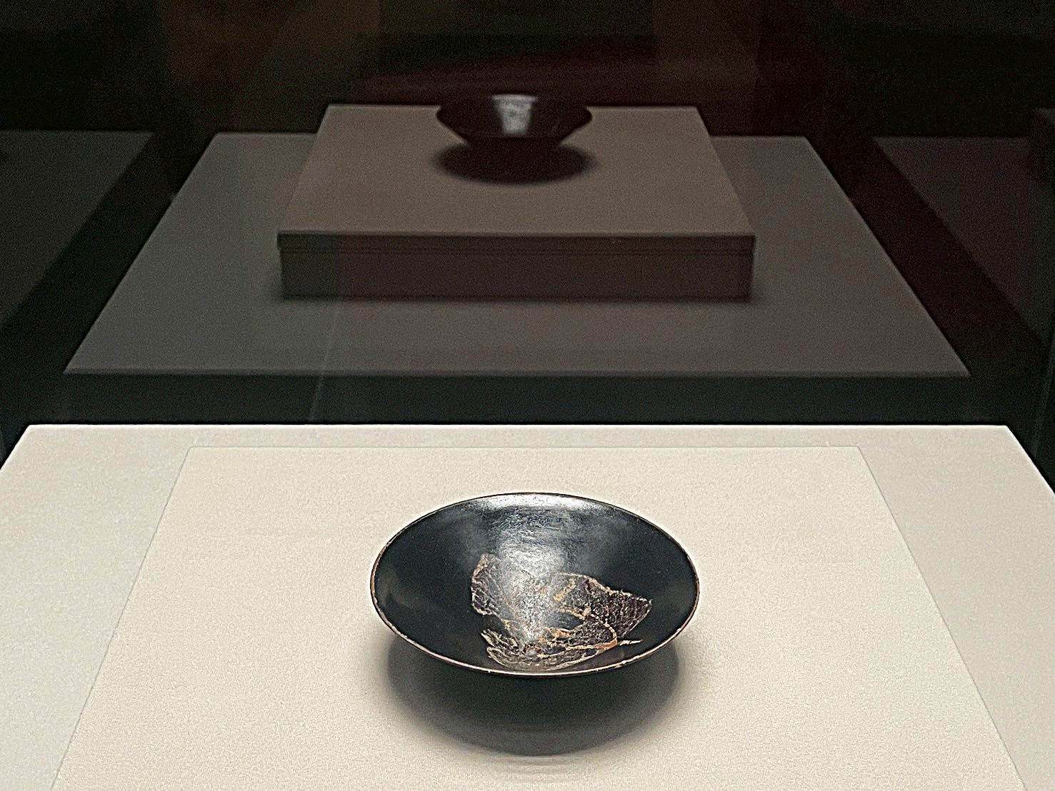 木葉天目茶碗 南宋時代(12-13世紀)/吉州窯 高5.0cm、径14.8cm 大阪市立東洋陶磁美術館(卯里欣侍氏寄贈/白檮廬コレクション) 実物の木の葉を用いて表された葉の文様と黒釉との対比が際立つ。中国江西 省(こうせいしょう)の吉州窯(きっしゅうよう)で南宋時代に焼かれ、日本に もたらされて茶の湯の道具として珍重された。黒釉のかかった茶碗を日本で「天 目」と呼ぶ習わしから、「木葉天目」と呼ばれている。