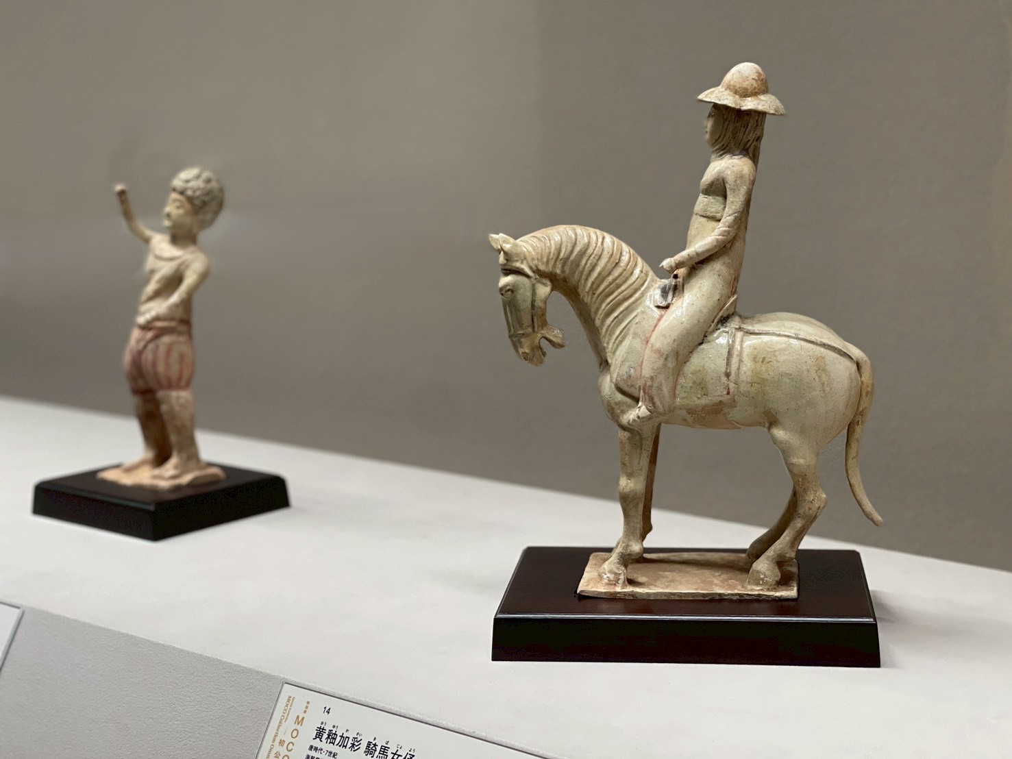 展示風景 手前:黄釉加彩 騎馬女俑 唐時代(7世紀)(海野信義氏寄贈) つば広の帽子をかぶる騎馬の女性俑で、黄釉の上から彩色が施される。左手で手綱を握り、首まで布を巻き砂を防いだ。類例が武将・張士貴墓(657年)から出土している。背筋を伸ばし、前を見据えて颯爽と馬を駆る姿が凛々しく、貴人の外出に伴う侍女と考えられる。