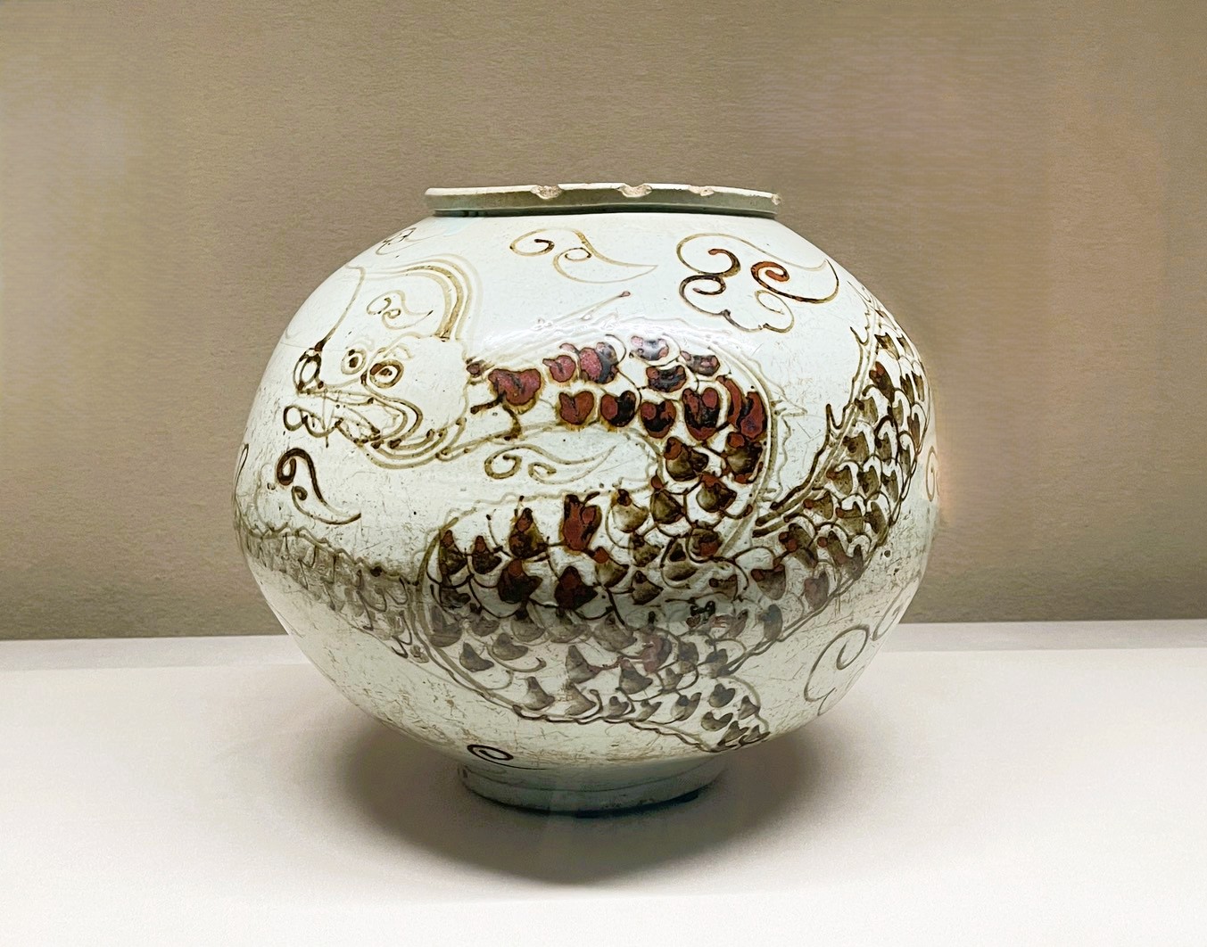 白濁釉輪花口水指 江戸時代(17世紀)/野々村仁清(御室窯) 高18.3cm、径18.9cm 大阪市立東洋陶磁美術館(松惠コレクション) 軽快な筆致で龍と雲が描かれる。龍はおどけた表情で、躍動感に満ちている。 宮中の儀式や宴会で用いられたと考えられ、王室の器を専門に焼いた京畿道 広州の新垈里(シンデリ)窯(1665‒1676)から類似した陶片が出土している。