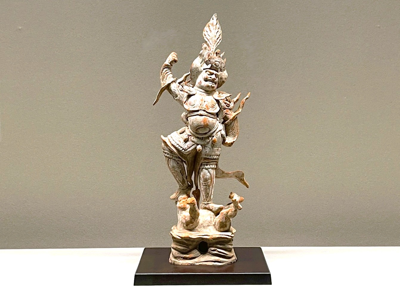 加彩天王俑 唐時代(8世紀) 高67.5cm、幅26.1×13.4cm 大阪市立東洋陶磁美術館(海野信義氏寄贈) 甲冑をまとい、険しい表情で腕を振り上げ、岩座上で邪鬼を踏む姿は、仏教 の四天王や神将の像に似る。天王俑は、墓の入口に置かれ、墓を守る役割を担っ た。華やかな冠や甲冑、動きのある力強いフォルムは、墓の守護者にふさわし い威厳を備えている。