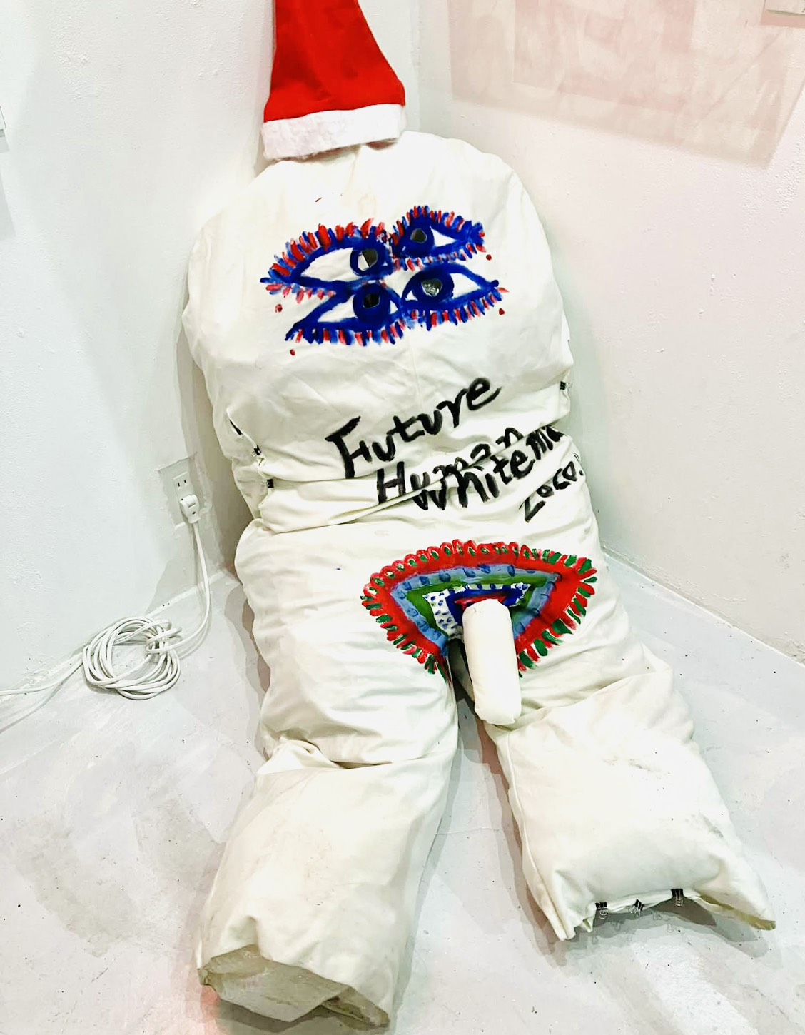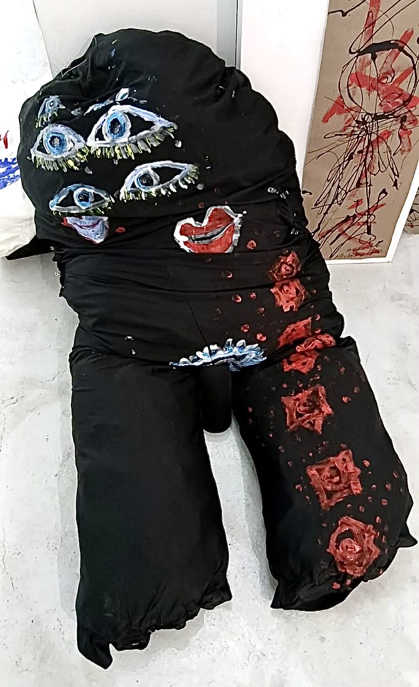 会場風景 床上の黒の大型作品:Crazy シリーズ 《未来人間ホワイトマン 2023B》