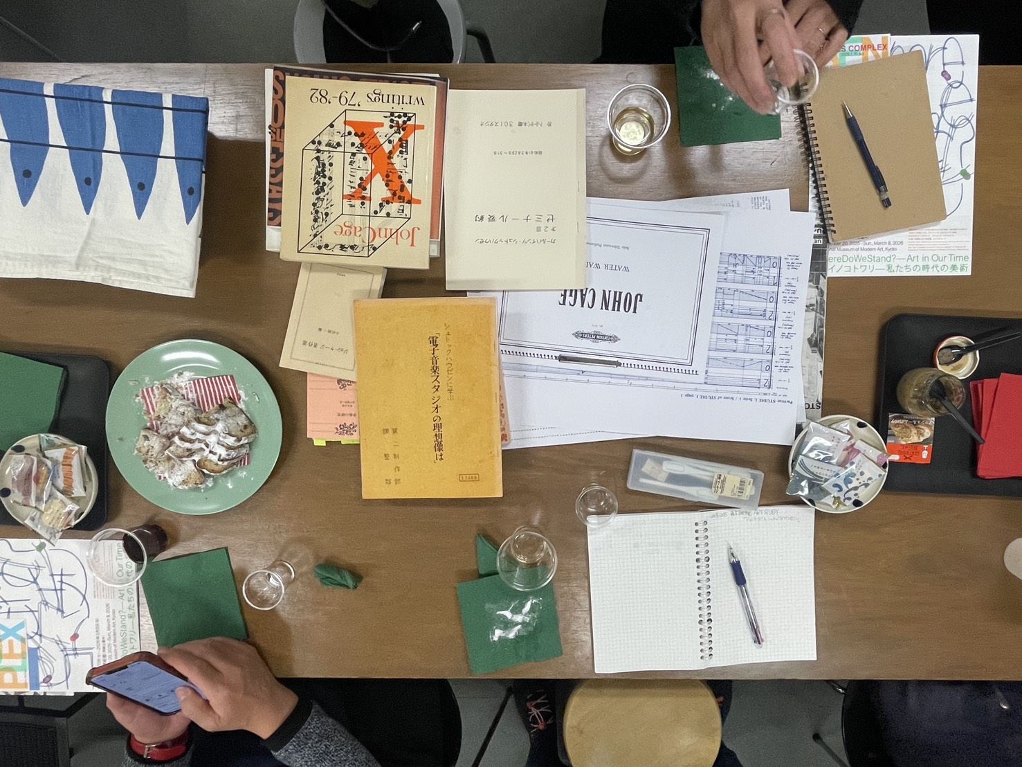 テーブルの上には、シュトックハウゼンの『コンタクテ(Kontakte)』の楽譜が置かれている。一見、複雑な数学的図形に見えるその楽譜を前に、「これで演奏するのかって驚きますから」という藤本氏の言葉に、聴衆は思わず笑みをこぼした。難解なはずの現代音楽の楽譜が、キノコのパテや焼酎と共に並べられ、気楽に触れられるオブジェとなっている。参加者たちが自由にレコードをかける行為は、ケージが意図した「誰でも好きな音を好きなだけ鳴らしていい」という音楽の解放を体現する、実に楽しい時間であった。これこそが、ケージとシュトックハウゼンが目指した「生活としての芸術」の光景そのものだったのではないだろうか。
