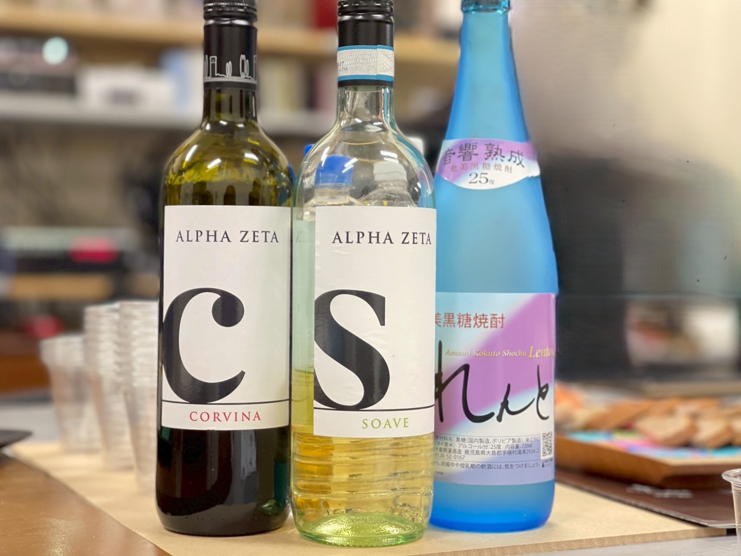 振る舞われたアルコール、奄美黒糖焼酎「れんと 25度」(音響熟成)、シュトックハウゼンとケージの名前にちなんだワイン「アルファゼータ ソ アーヴェ(‘S’ Soave)」と「アルファ ゼータ チ コルヴィーナ(‘C’ Corvina)」