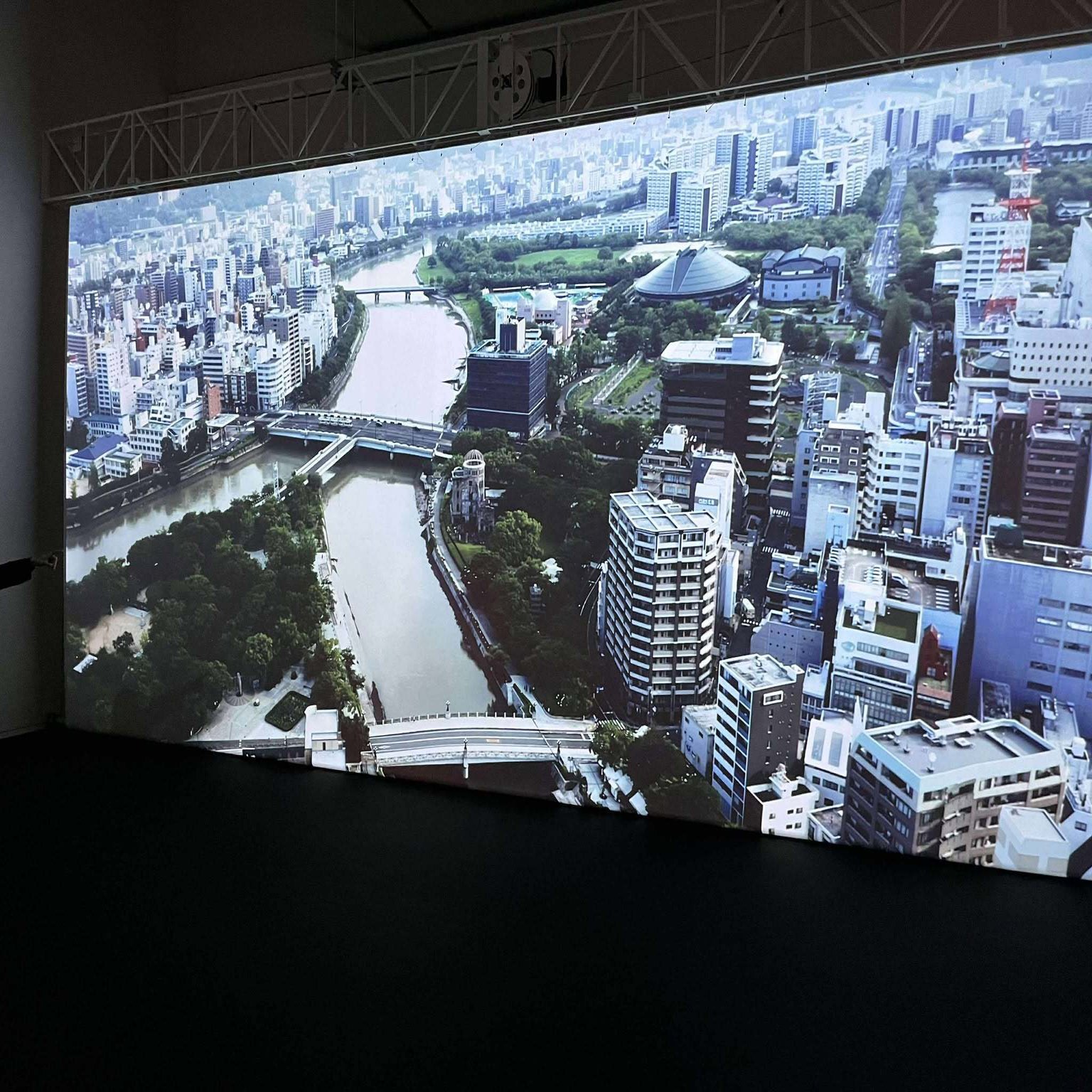 大きなスクリーンに、「ヒロシマ」という文字が出て、その後に写し出されるのは、広島市街を上空から眺めた映像です。だんだんと近づいてくるのは、原爆がターゲットとしていた橋です。