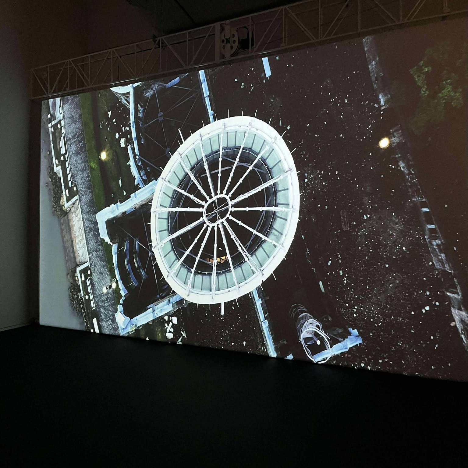原爆は、ターゲットの橋を少し外してしまい、原爆ドームの真上に来てしまいます。ジャーによると、これは、世界で初めて原爆ドームを真上からドローンで捉えることを許された映像です。そしてここに来てハッと気づくのは、私たちの視点が、まさに原爆ドームの上に落ちようとしている「原爆の目」になっていること!
