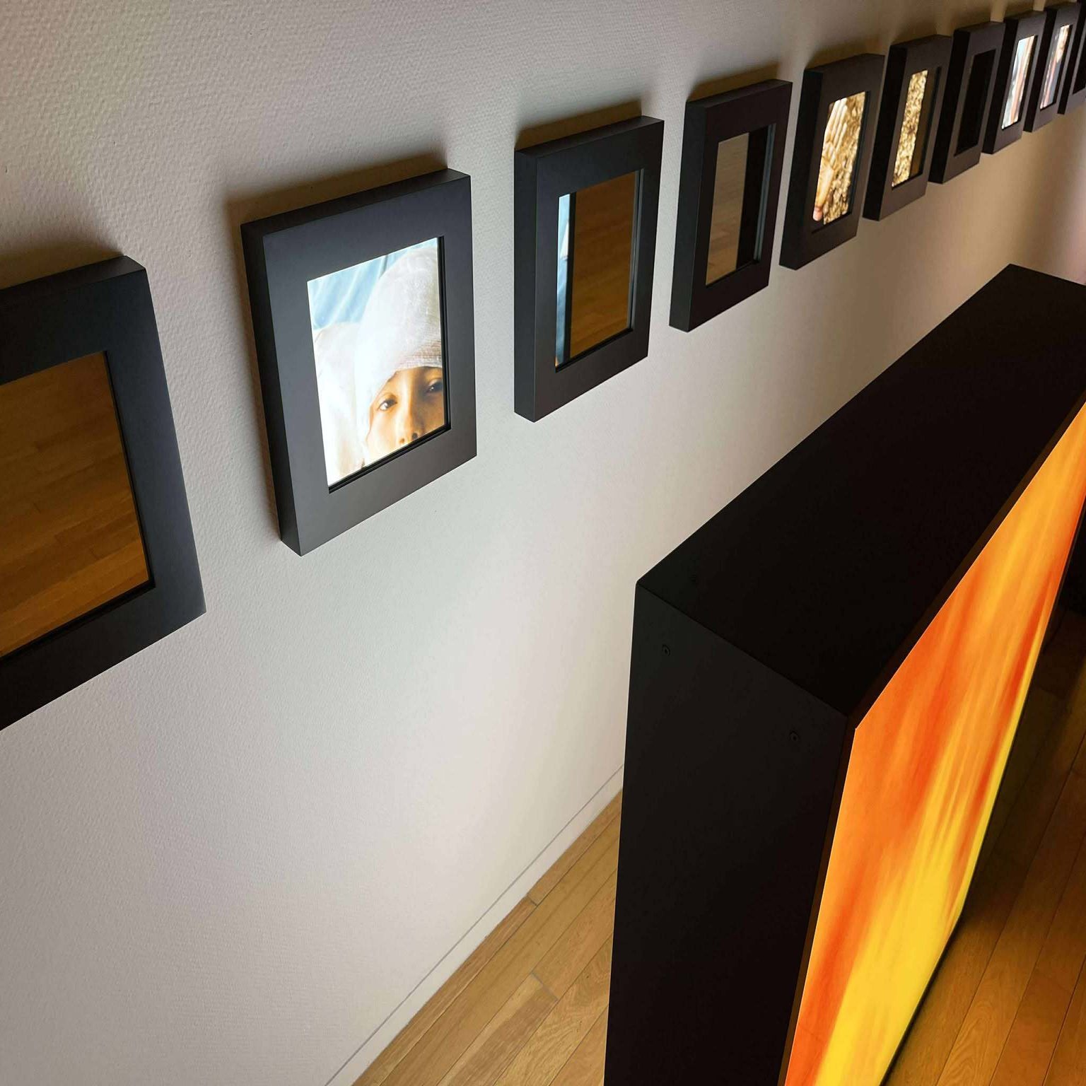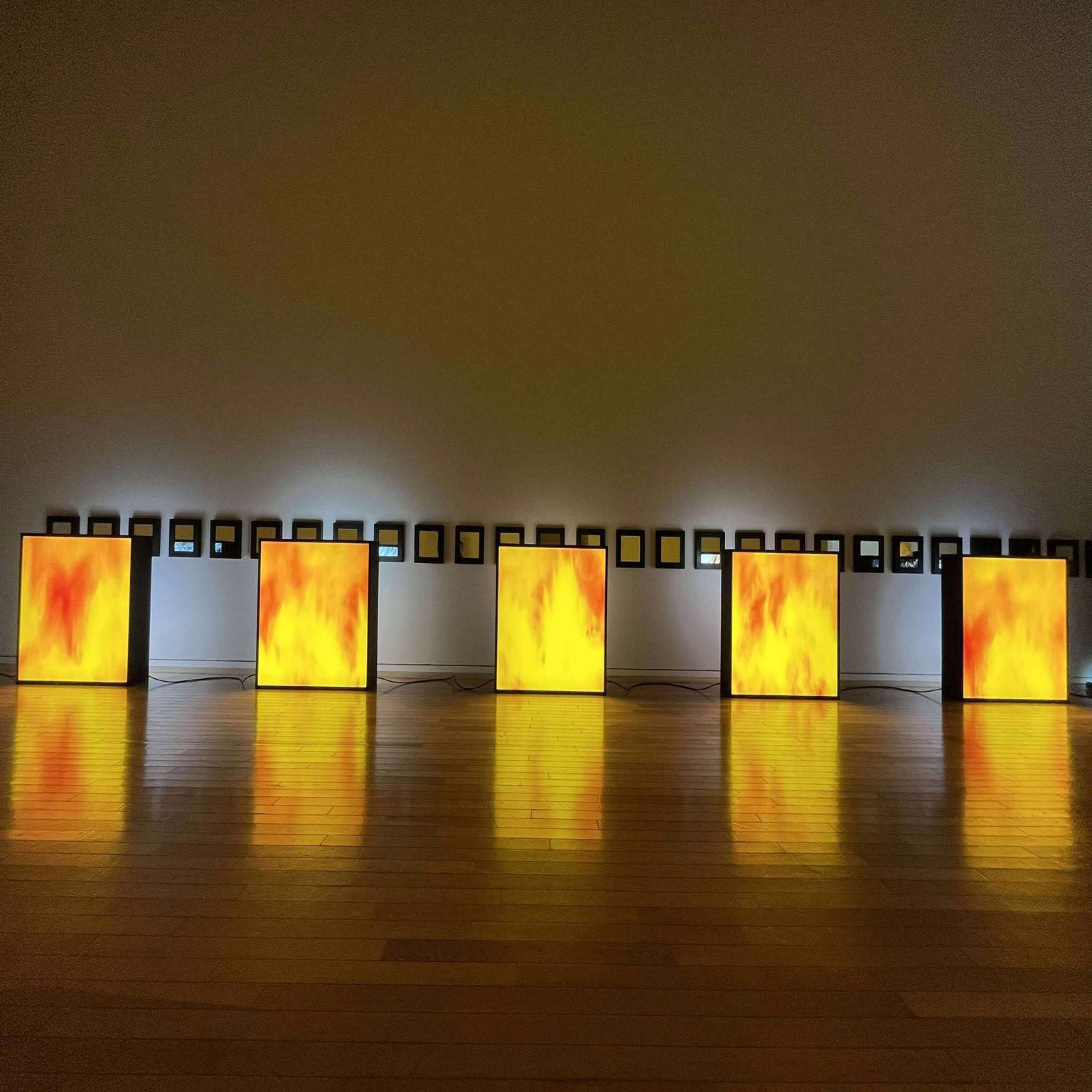 例えばこの《エウロパ》という作品。6つの両面ライトボックスと30枚の額装ミラーによって構成される、1990年代初頭に勃発したボスニア紛争の情景を表すものです。