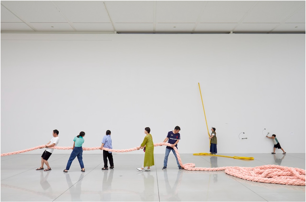 Decorator Crab – Expecting Spectators《デコレータークラブ—0人もしくは1人以上の観客に向けて》, 2021 Installation view: “Art Lab 04: Decorator Crab – Expecting Spectators” Chiba City Museum of Art, Japan Dimensions variable. Rope, winch, pulley, wood Photo: © Takehiro Iikawa, courtesy of the artist Studio Takehiro Iikawa(HP)より