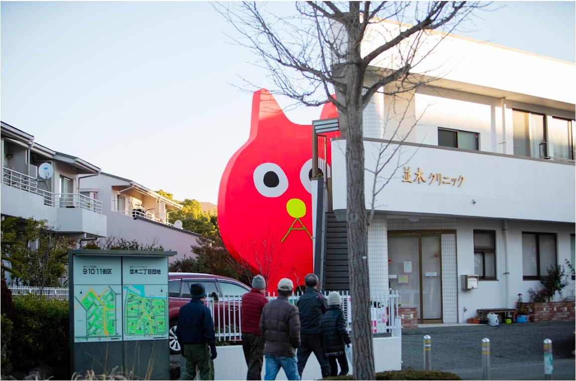 代表作の一つ《ピンクの猫の小林さん》は、そのコンセプトを最もよく体現している。これは巨大なピンク色の猫のオブジェであるが、建物の影や、壁の向こう側など、その全貌を一目で見渡すことが物理的に不可能な場所に配置されることが多い。 「全体像が見えないことで、人は想像力を働かせます。『あれは何だろう?』『なんであんな狭いところにいる?』『こっちを見てる?』と、人は見えないものを補完するために動き回る。その能動的なアクションを僕は作り出したいんです。」と飯川は解説する。