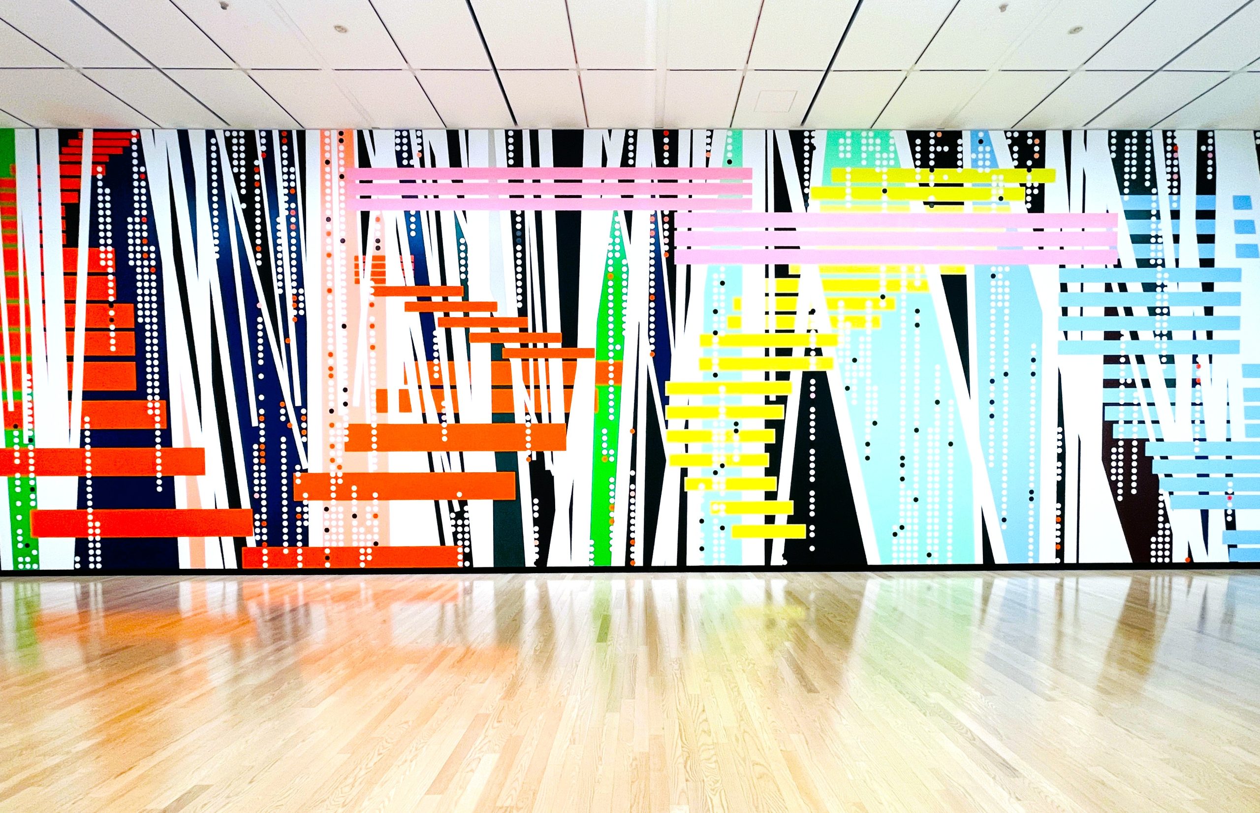 サラ‧モリス《社会は抽象的であり、⽂化は具体的で ある [サウンドグラフ]》2018年 家庭⽤グロス塗料、カンヴァス 214 x 428 cm ⼤阪中之島美術館