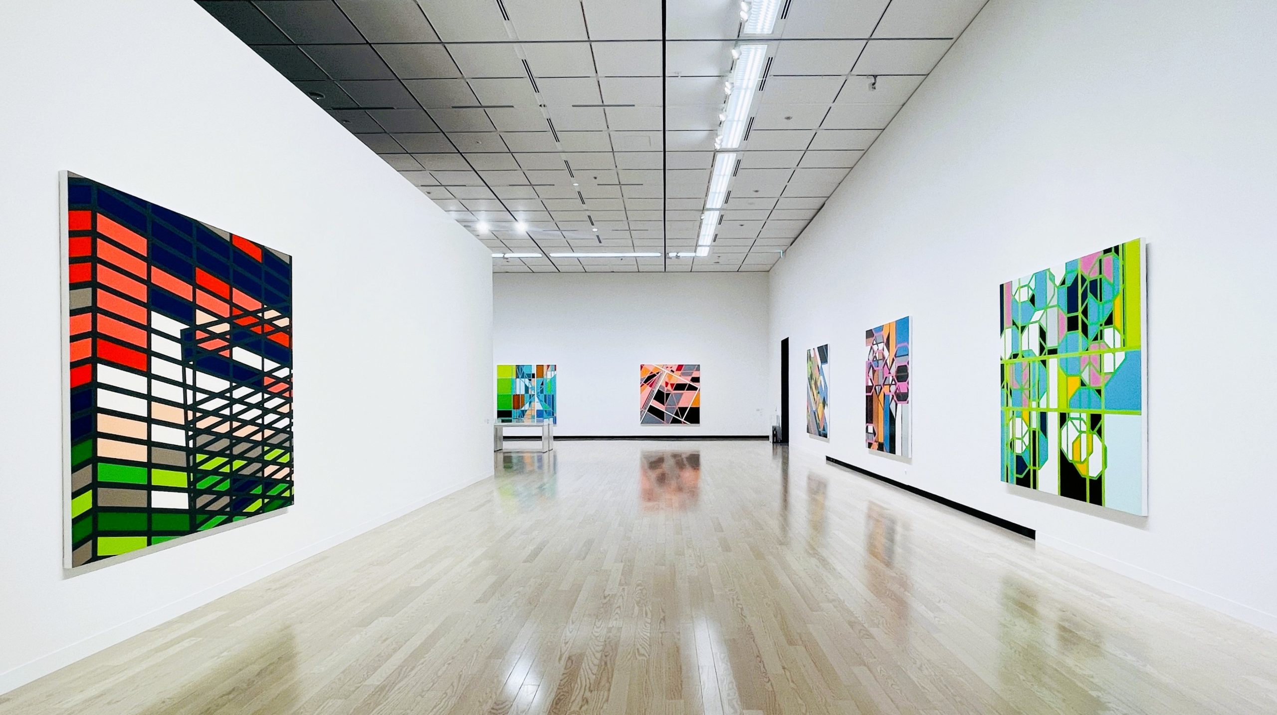 本展は他都市への巡回がなく、この壮大なスケールの展示を体験できるのは、日本で唯一、大阪中之島美術館の会場だけである。展示室を埋め尽くす100点近い作品群は、彼女が追求してきた、都市、建築、そしてそこに渦巻く権力の構造を鮮やかに解体し、再構築してみせている。会場に足を踏み入れた瞬間、天井高を活かした空間構成と、工業的な光沢を放つキャンバスの圧倒的な視覚圧力に、私たちは現代社会の「神経系」を覗き見るような感覚に陥るだろう。