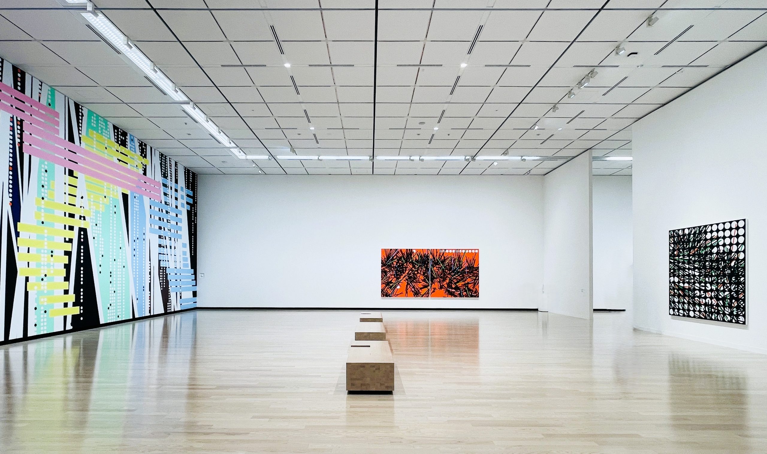 展示風景 真ん中:サラ‧モリス《ミッドタウン – 蛍光灯の灯るシーグラム‧ビルディング》1999 年 家庭⽤グロス塗料、カンヴァス 214 x 214 cm 個⼈蔵 ©Sarah Morris