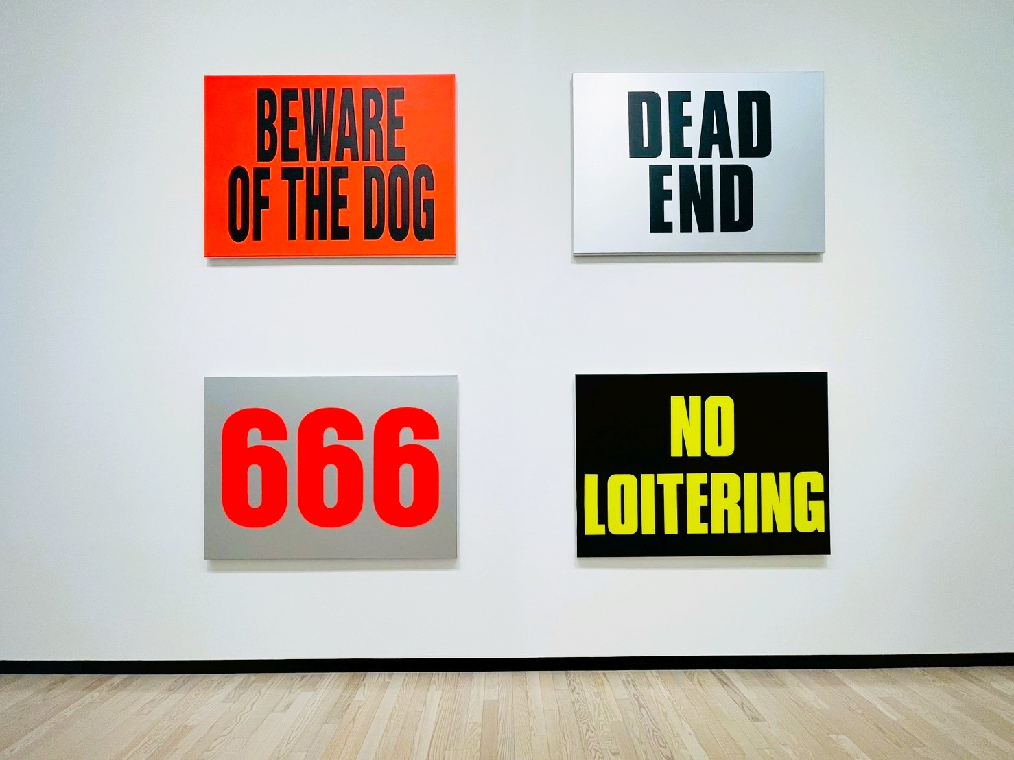 初期の代表作である《BE WARE OF THE DOG(猛犬注意)》(1994年)のような、ホームセンターで売られている私有地の境界線用の注意看板のタイポグラフィーを引用・再解釈したサイン絵画から、近年の複雑なグリッド作品に至るまで、この光沢は一貫している。初期作において彼女は、アメリカ社会に根ざした自衛意識や排他性、あるいは「ルール」という名の権力が、いかに簡潔な視覚記号として流通しているかを突きつけた。