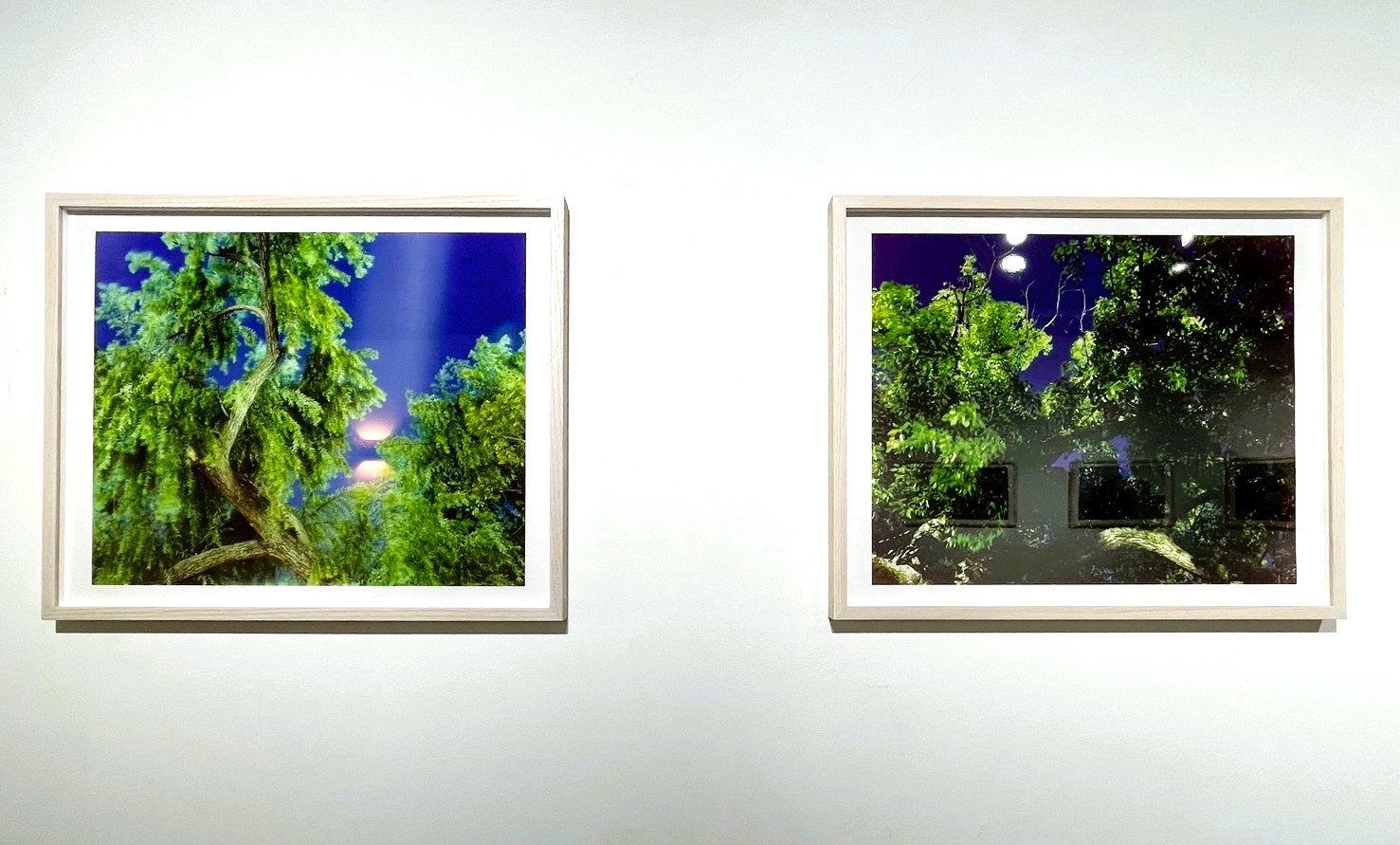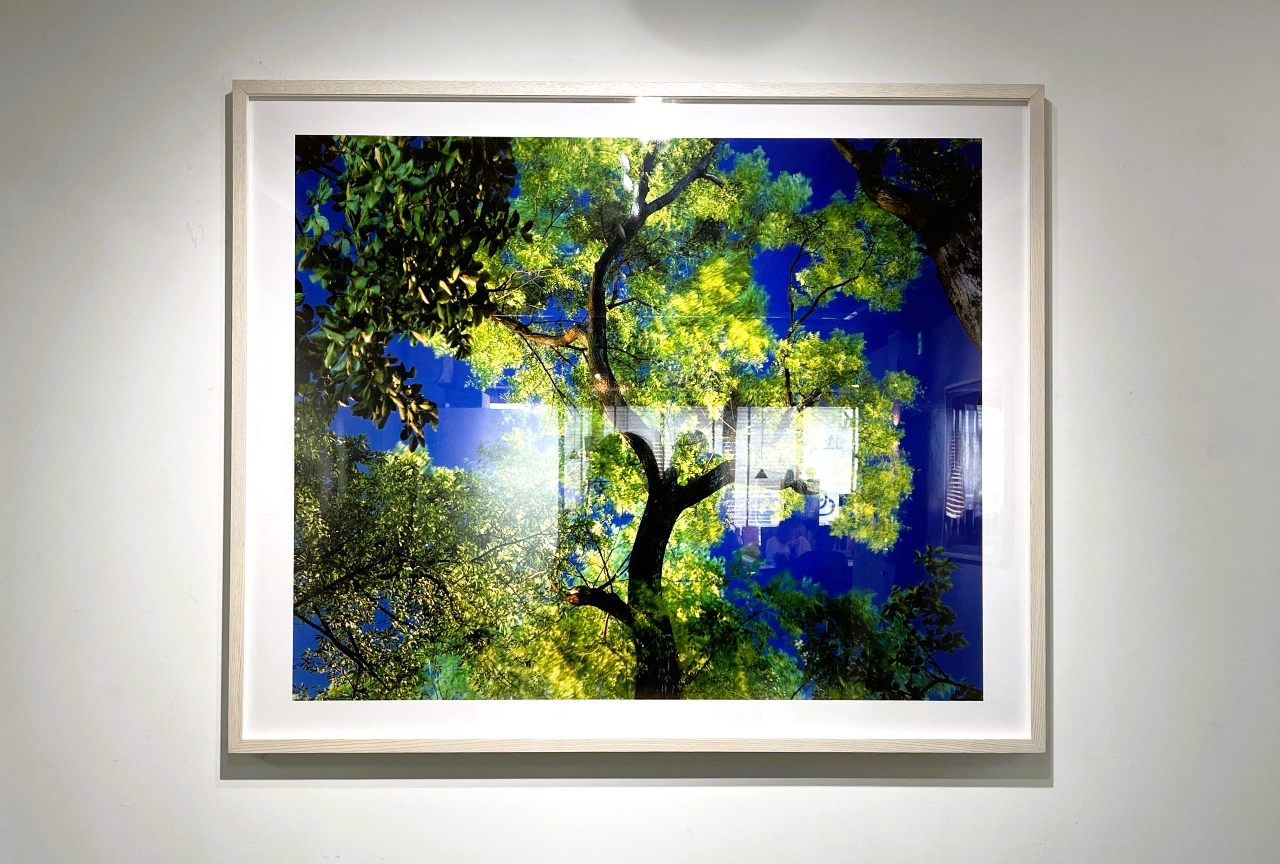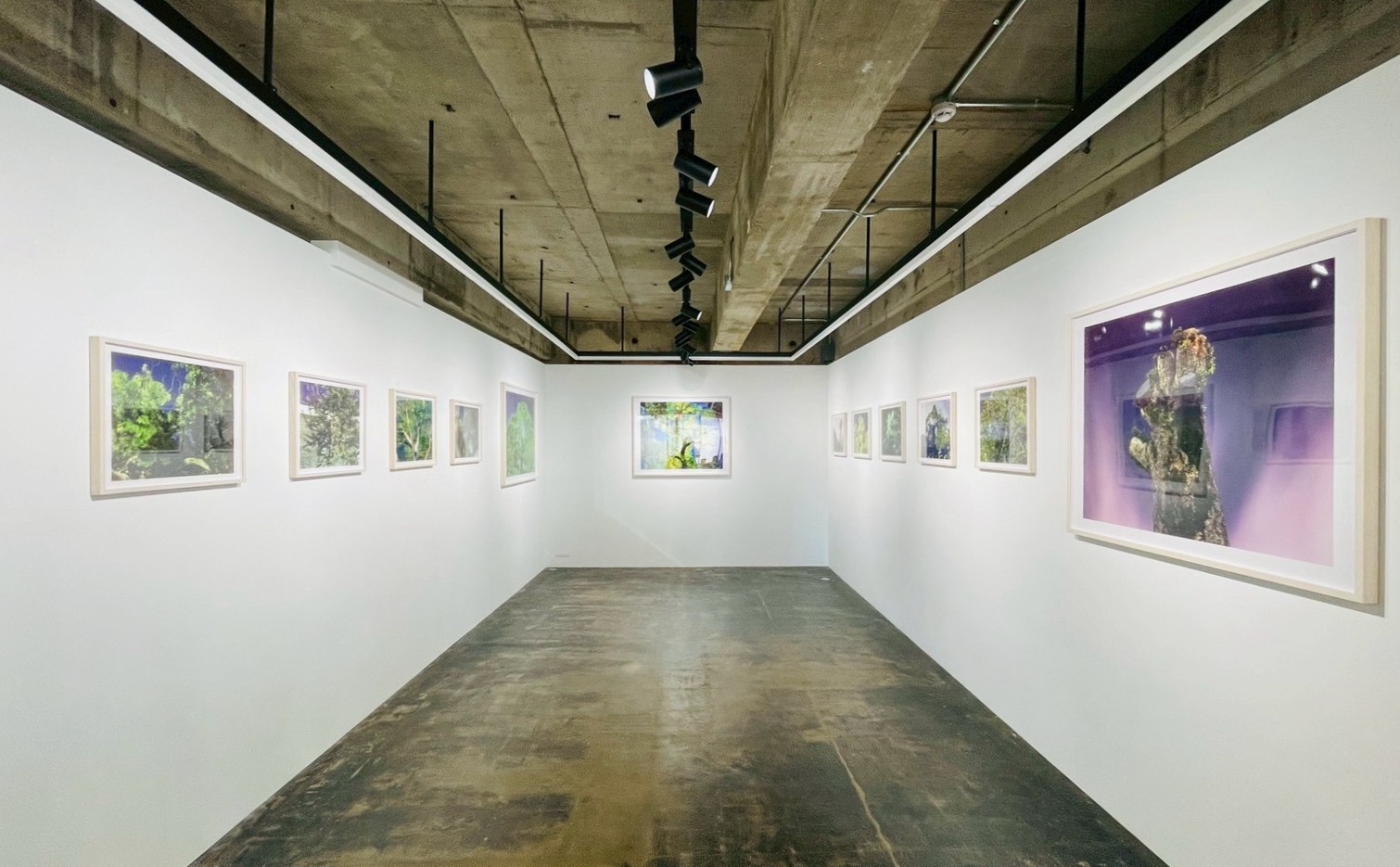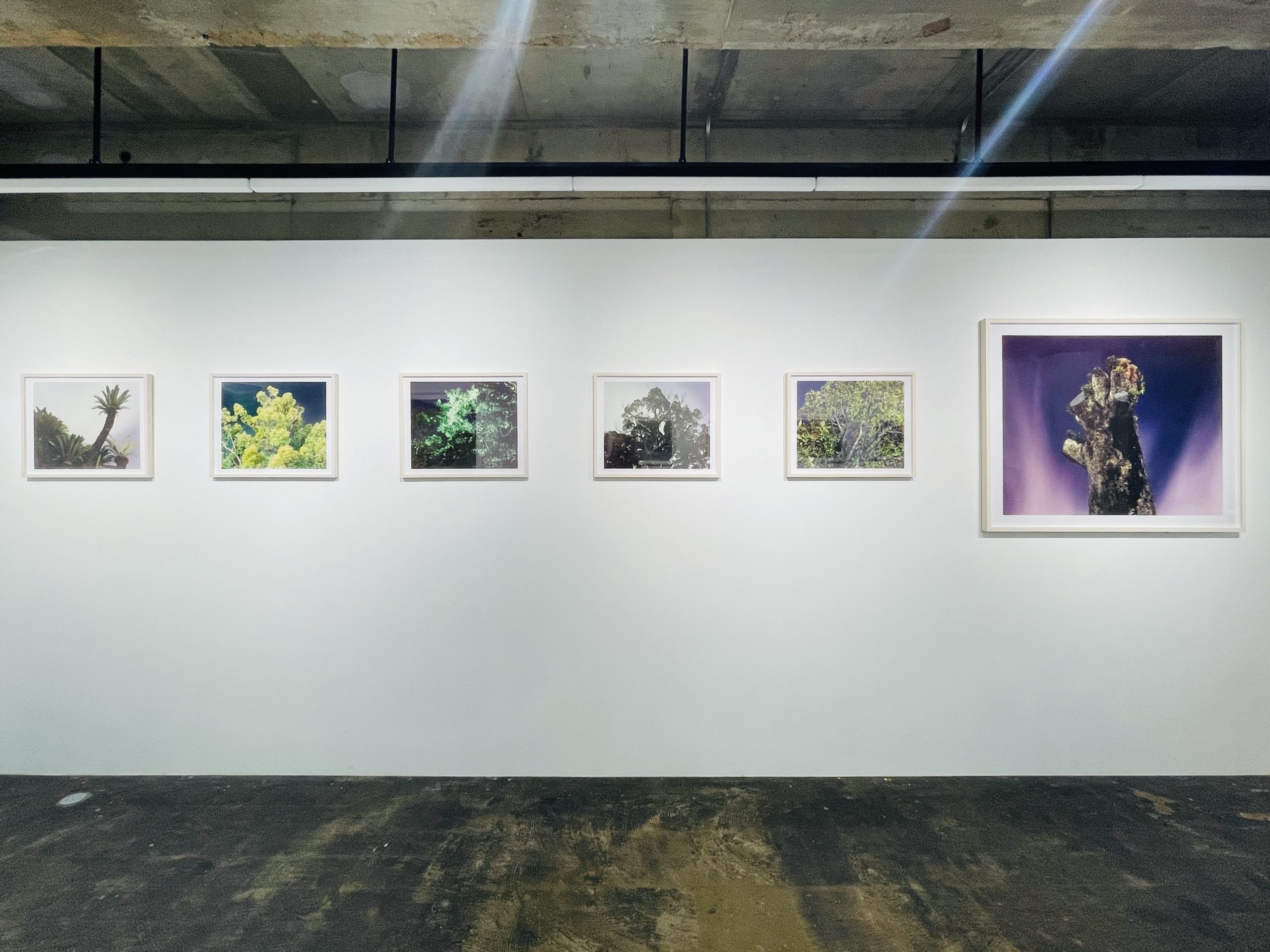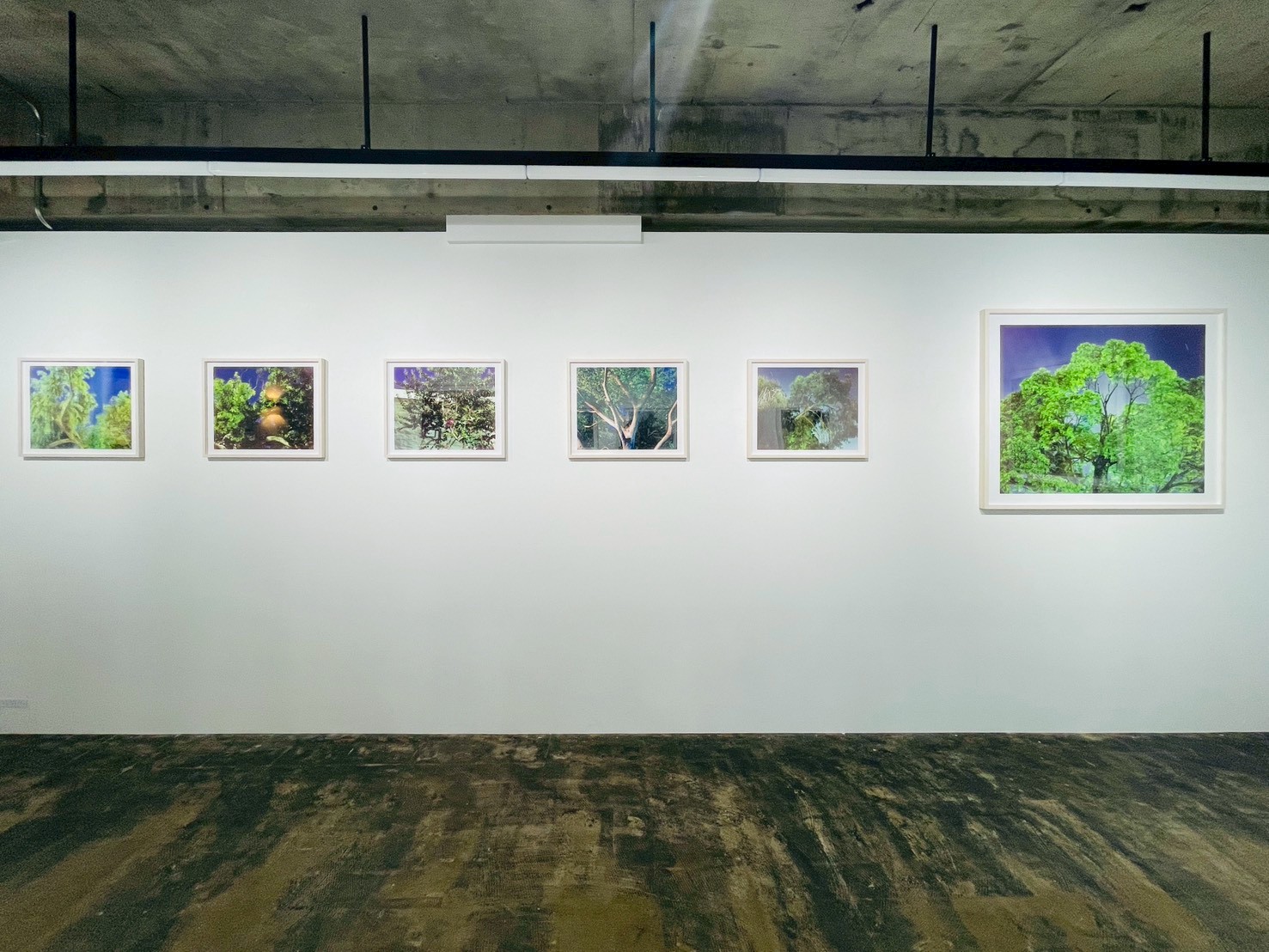 会場に足を踏み入れると、まず目に飛び込んでくるのは、剥き出しのコンクリート天井と冷徹な白い壁面、そしてそこに整然と、しかし圧倒的な熱量を持って並べられた鮮烈な色彩の木々の姿だ。暗い夜空を背景に、異様なほど鮮やかに浮かび上がる葉の一枚一枚、そして歪んだ幹の質感は、単なる風景写真の域を遥かに超えている。それは、この世界に刻まれた「見えない時間」の集積として網膜に直接訴えかけてくる。
