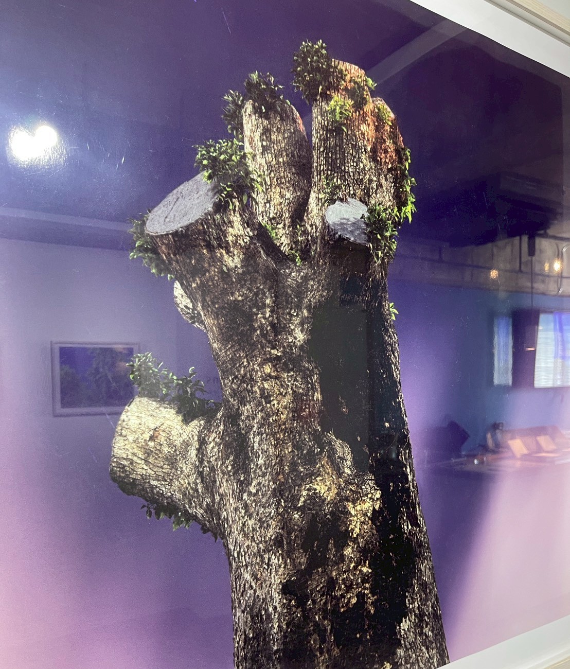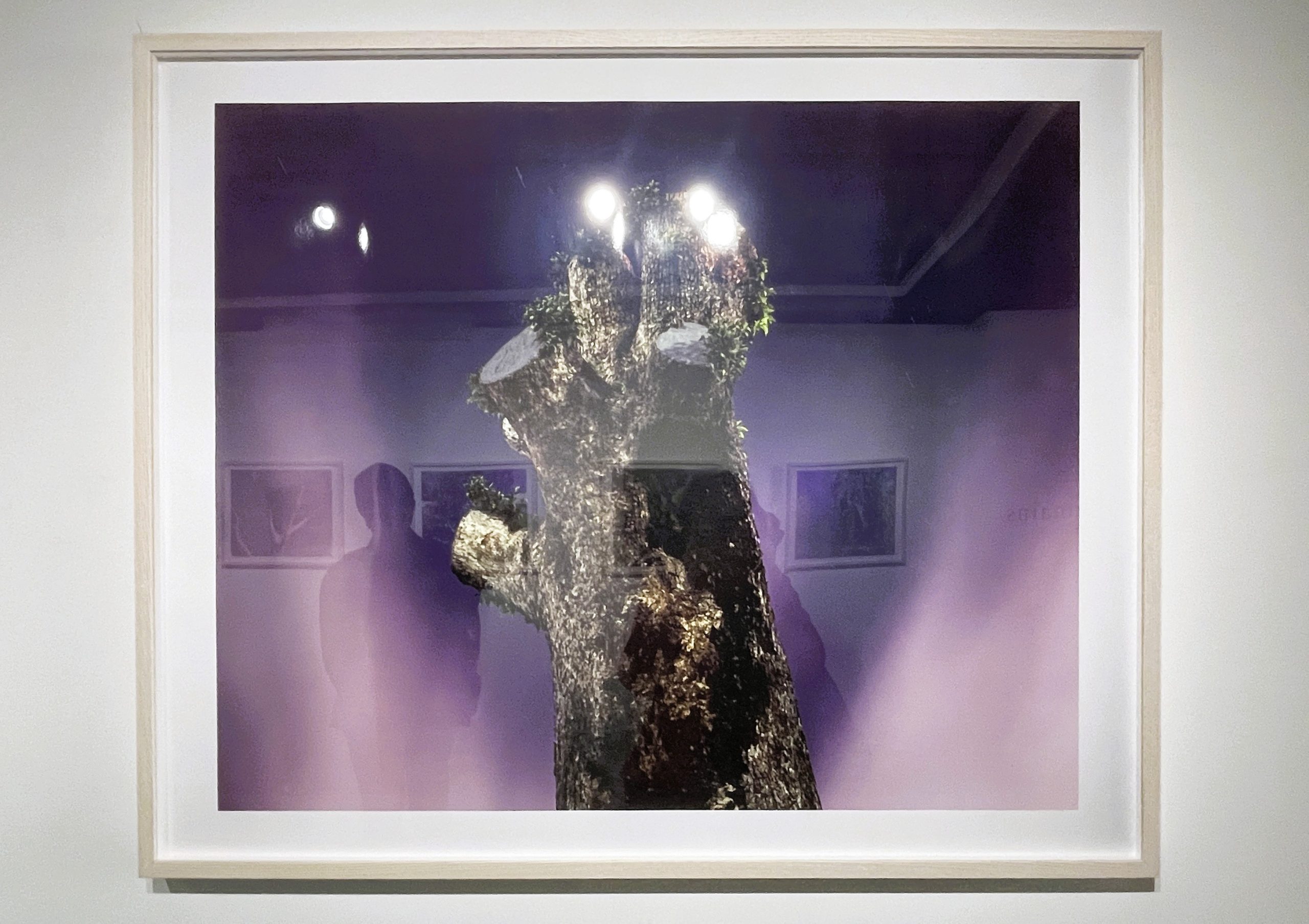 通常、写真展示において「映り込み」は鑑賞を妨げるノイズとして忌避される。しかし、勝又の「Remains」においては、この反射すらも作品の重要な構成要素として機能しているのではないか。鏡面のようなガラスに映る「現代の衣服を纏った私たち」と、その奥に広がる「1945年を生き延びた樹木の闇」。この二つの層が視覚的に重なり合うとき、私たちは歴史の外部にいる「安全な鑑賞者」でいられなくなる。