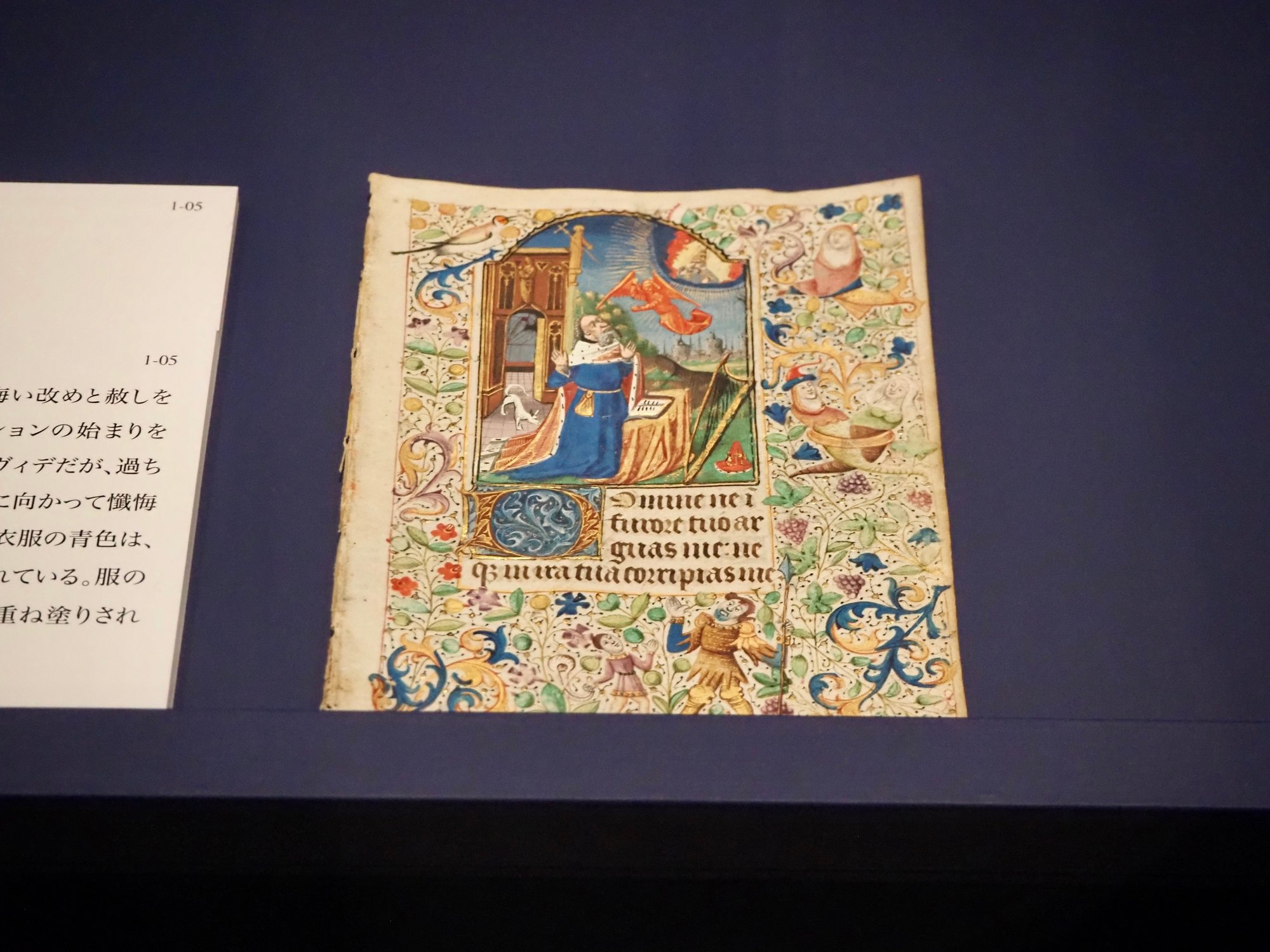 「時祷書」は、一日のうちの定められた時間に捧げる祈りが書かれた、キリスト教の一般信徒のための本のことという。「零葉」は書籍のあるページが切り取られたものを指す。あまりにも美しいので、鑑賞して飾れるように切り取られたのである。この時祷書の絵に描かれている聖セバスティアヌスは、3世紀にローマ皇帝の迫害に遭って殉教した聖人で、宗教絵画でもよく描かれる画題である。描かれた聖人には多くの矢が刺さっており、なかなか残酷な場面のはずなのだが、この零葉はひたすら美しい。